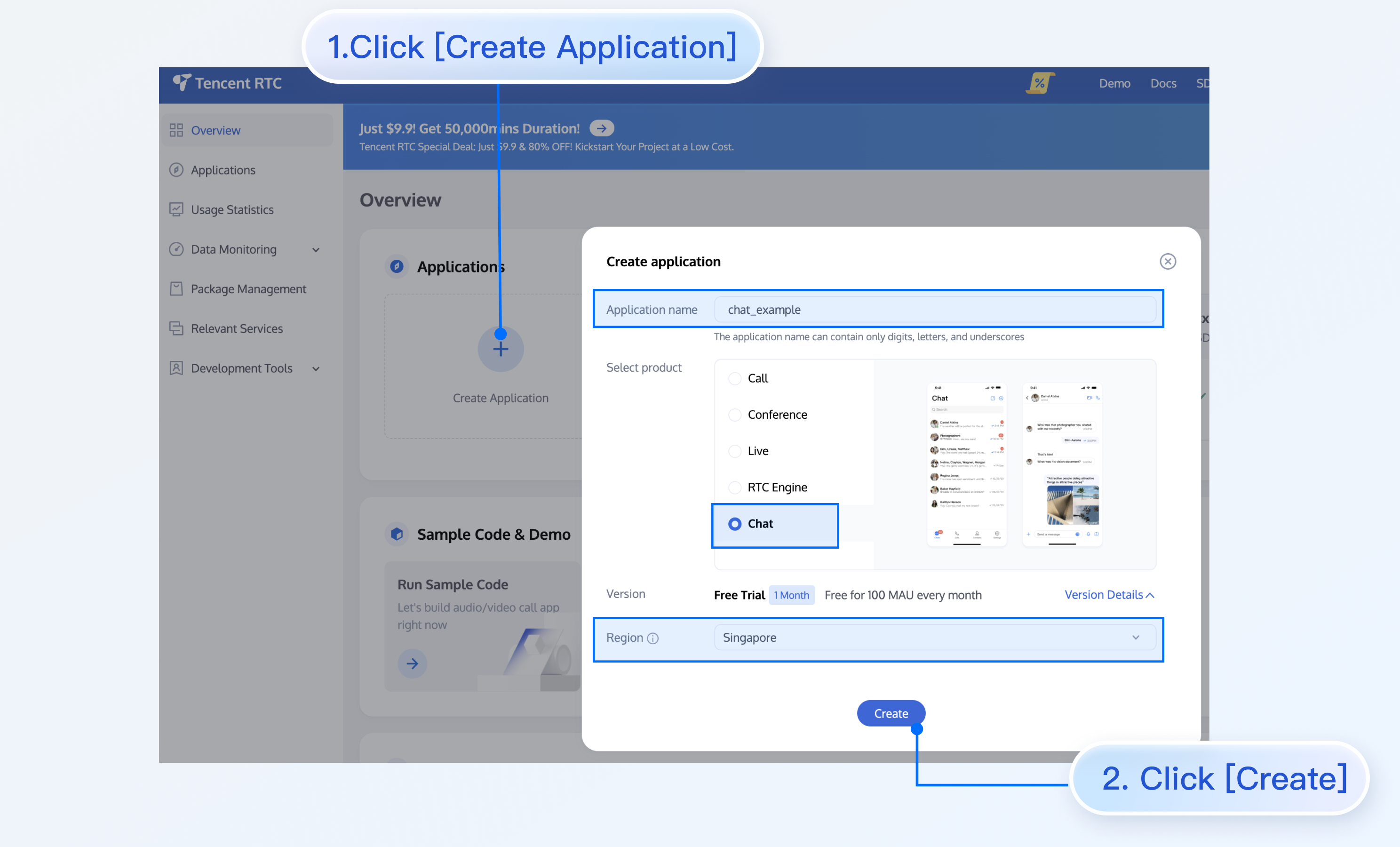 V2TIMSDKConfig 对象。initSDK 初始化 SDK。Create Applicaion 按钮,创建新的 SDKAppID。