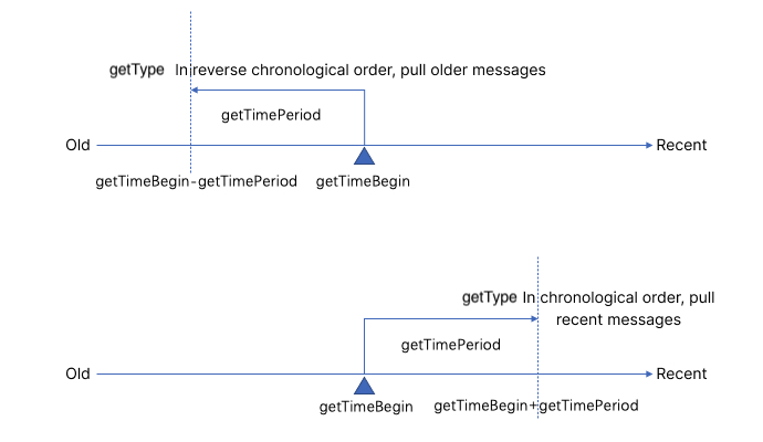 getTimePeriod | 拉取消息的时间范围。单位:秒 | YES | YES | NO | 1. 默认为 0,表示不限制时间范围。 2. 取值的范围区间为闭区间,包含起止时间,二者关系如下: 如果 getType 指定了朝消息时间更老的方向拉取,则时间范围表示为 [getTimeBegin - getTimePeriod, getTimeBegin]。如果 getType 指定了朝消息时间更新的方向拉取,则时间范围表示为 [ getTimeBegin, getTimeBegin + getTimePeriod]。 |