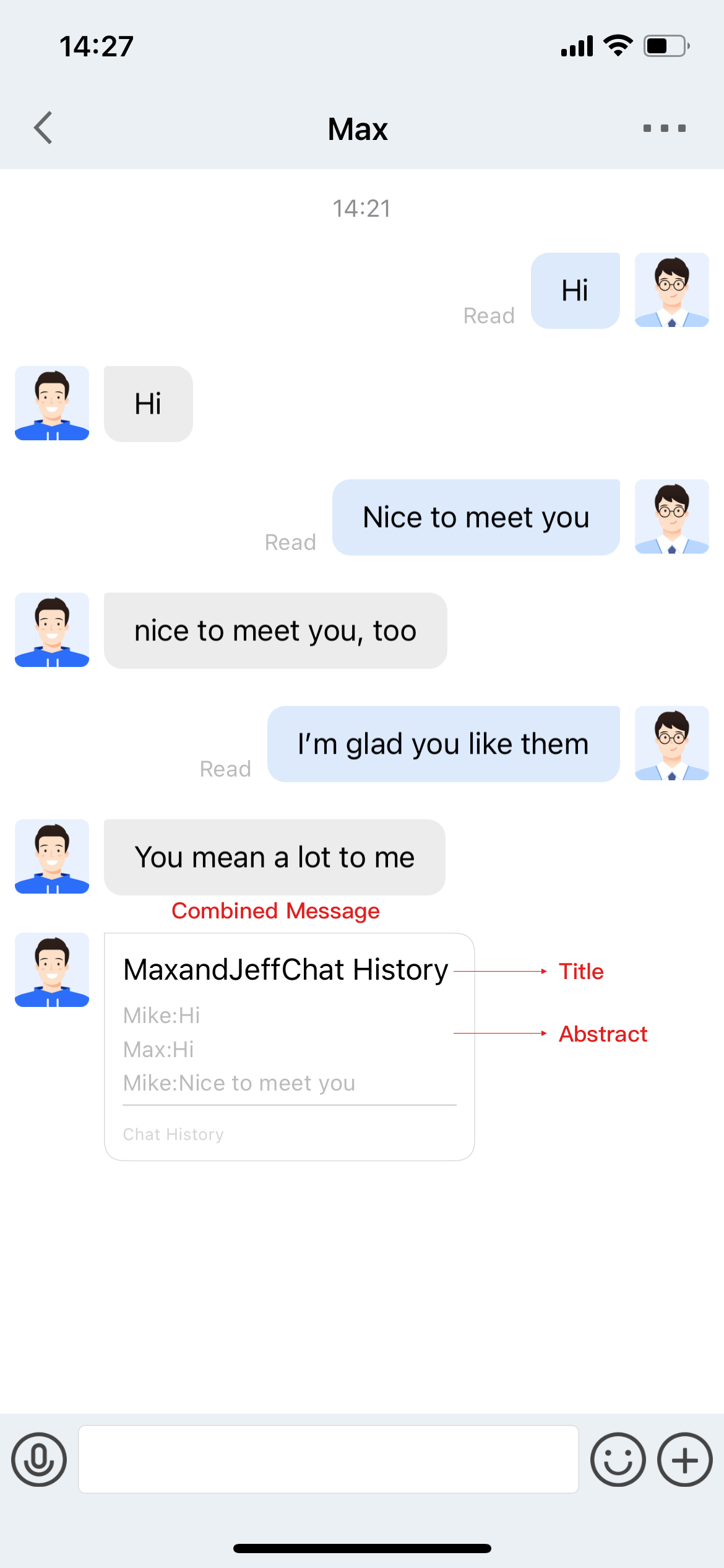 compatibleText | String | 兼容文本,低版本 SDK 如果不支持合并消息,默认会收到一条文本消息,文本消息的内容为 ${compatibleText},必填 |