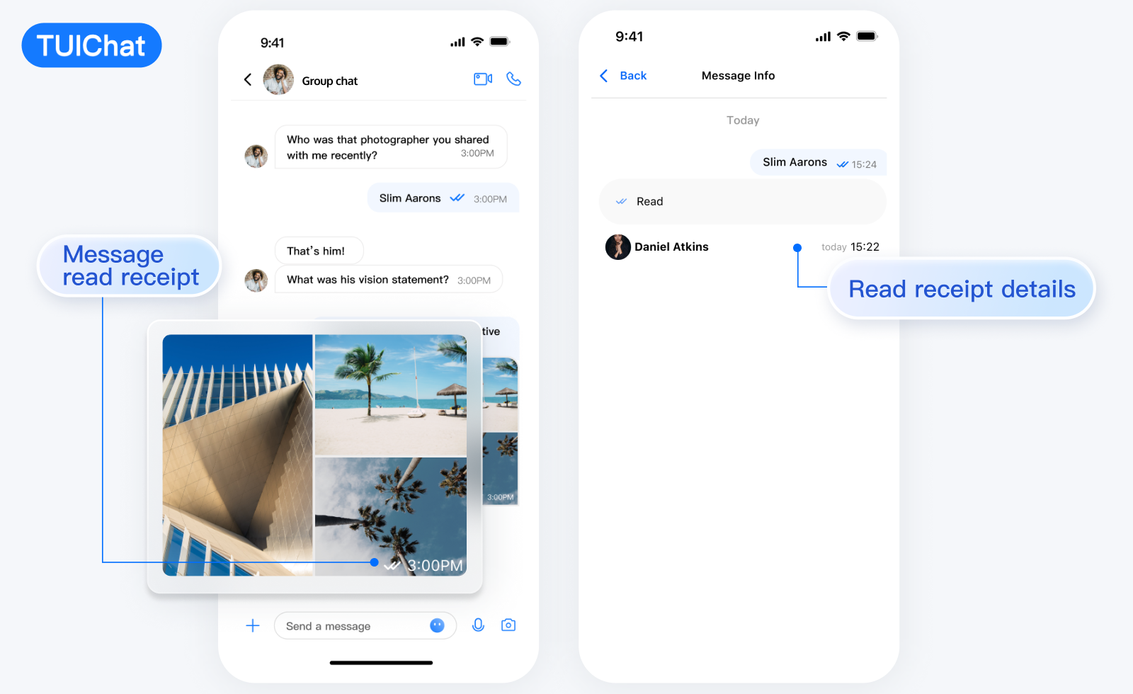 // 接口调用示例(以 Group 消息为例)V2TIMManager.shared.getGroupHistoryMessageList(groupID: "groupA", count: 20, lastMsg: nil, succ: { msgs invar receiptMsgs: [V2TIMMessage] = []// 自己发送的消息 && 需要已读回执,需要拉取消息的已读回执信息for msg in msgs {if msg.isSelf && msg.needReadReceipt {receiptMsgs.append(msg)}}V2TIMManager.shared.getMessageReadReceipts(messageList: receiptMsgs, succ: { receiptList invar param: [String: V2TIMMessageReceipt] = [:]for receipt in receiptList {if let msgID = receipt.msgID {param[msgID] = receipt}}for msg in msgs {if let receipt = param[msg.msgID] {// C2C 消息对方 IDlet userID = receipt.userID// C2C 消息对方已读状态let isPeerRead = receipt.isPeerRead// C2C 消息对方已读时间let timestamp = receipt.timestamp// 群组 IDlet groupID = receipt.groupID// 消息已读数,readCount 为 0,表示消息无人已读let readCount = receipt.readCount// 消息未读数,unreadCount 为 0,表示消息全部已读let unreadCount = receipt.unreadCount// 这里可以添加处理已读回执的逻辑print("Message ID: \\(msg.msgID), User ID: \\(userID), Is Peer Read: \\(isPeerRead), Timestamp: \\(timestamp), Group ID: \\(groupID), Read Count: \\(readCount), Unread Count: \\(unreadCount)")}}}, fail: { code, desc in// 拉取消息已读状态失败print("拉取消息已读状态失败,code: \\(code), desc: \\(desc)")})}, fail: { code, desc in// 拉取消息失败print("拉取消息失败,code: \\(code), desc: \\(desc)")})