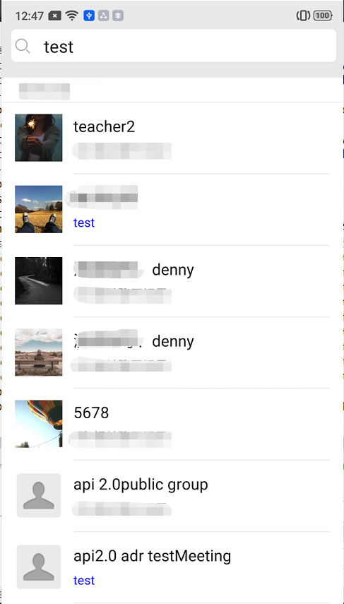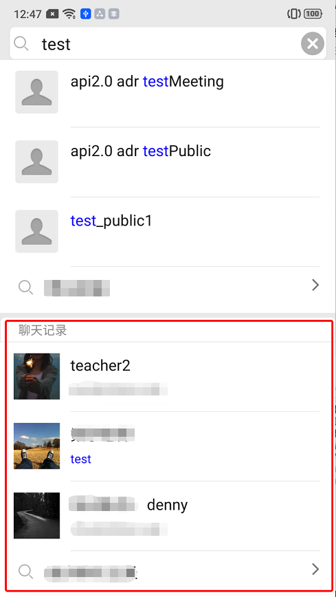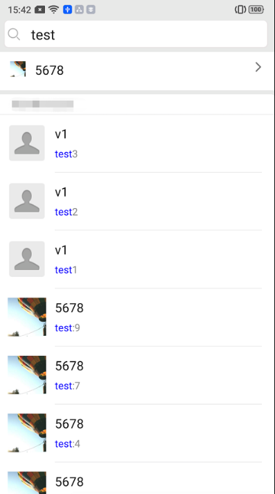V2TIMMessageSearchParamconversationID 设置为 null,表示搜索所有会话的消息。pageIndex 设置为 0,表示搜索到的消息所属的会话的首页数据。pageSize 设置为 3,表示返回最近的会话数量,UI 上一般显示 3 条。V2TIMMessageSearchResulttotalCount 表示匹配到的消息所属的所有会话数量。messageSearchResultItems 列表为最近 3(即入参 pageSize)个会话信息。其中元素 V2TIMMessageSearchResultItem 的 messageCount 表示当前会话搜索到的消息总数量;messageList 为空,您可以在 UI 上显示 “4 条相关聊天记录”,其中的 4 为 messageCount。messageList 为匹配到的那条消息,您可以在 UI 上显示消息内容并高亮搜索关键词,例如图中的 “test”。// 通过指定messageTypeList上搜索指定类型消息V2TimValueCallback<V2TimMessageSearchResult> searchMessage = await messageManager.searchLocalMessages(searchParam: V2TimMessageSearchParam(keywordList: ['关键词1'],pageIndex: 0,pageSize: 10,type: 1,conversationID: "",messageTypeList: [MessageElemType.V2TIM_ELEM_TYPE_TEXT]));