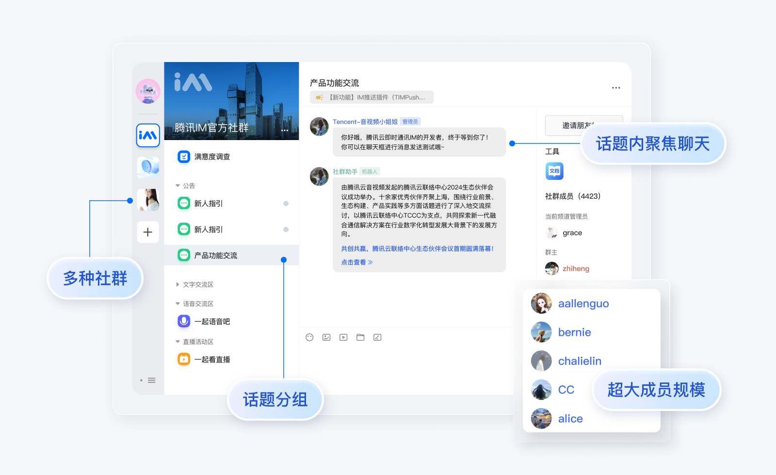 // 创建支持话题的社群let promise = chat.createGroup({type: TencentCloudChat.TYPES.GRP_COMMUNITY,name: 'WebSDK',isSupportTopic: true,});promise.then(function(imResponse) { // 创建成功console.log(imResponse.data.group); // 创建的群的资料}).catch(function(imError) {console.warn('createGroup error:', imError); // 创建群组失败的相关信息});