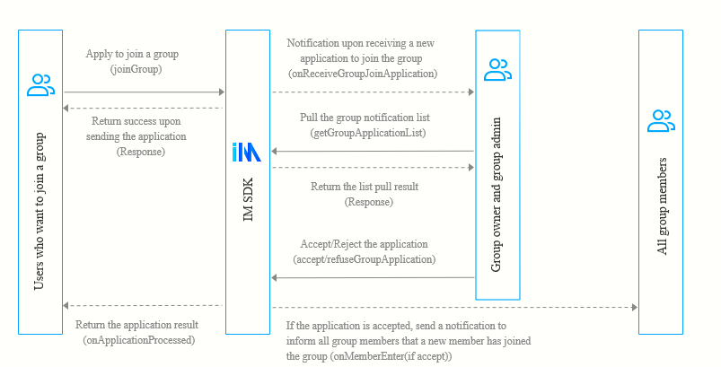 joinGroup (Details) 申请加群。onReceiveJoinApplication (Details) ,在其中调用 getGroupApplicationList (Details)获取加群申请列表。acceptGroupApplication (Details) 同意加群,或调用 refuseGroupApplication (Details) 拒绝加群请求。onApplicationProcessed (Details) 回调。其中 isAgreeJoin 为 true 表示同意加群,反之被拒绝。onMemberEnter (Details) 回调,通知群组成员有人进群。// ******群主端******//// 1、群主端修改加群选项为需要审核groupManager.setGroupInfo(info: V2TimGroupInfo.fromJson({"groupAddOpt":GroupAddOptTypeEnum.V2TIM_GROUP_ADD_AUTH}));// 2、群主端监听加群请求并处理TencentImSDKPlugin.v2TIMManager.addGroupListener(listener: V2TimGroupListener(onReceiveJoinApplication: (groupID, member, opReason) async {// 获取所有申请V2TimValueCallback<V2TimGroupApplicationResult> appls = await groupManager.getGroupApplicationList();appls.data.groupApplicationList.forEach((application) {// 同意groupManager.acceptGroupApplication(groupID: application.groupID, fromUser: application.fromUser, toUser: application.toUser,type: GroupApplicationTypeEnum.values[application.type]);// 拒绝groupManager.refuseGroupApplication(groupID: application.groupID, fromUser: application.fromUser, toUser: application.toUser, addTime: application.addTime, type: GroupApplicationTypeEnum.values[application.type]);});},));// ******用户端******//// 1、用户端申请加群TencentImSDKPlugin.v2TIMManager.joinGroup(groupID: "groupID",message: "hello",groupType: "Public");// 2、用户端监听加群审批结果TencentImSDKPlugin.v2TIMManager.addGroupListener(listener: V2TimGroupListener(onApplicationProcessed: ((groupID, opUser, isAgreeJoin, opReason) {// 加群申请被处理}),onMemberEnter:(groupID,memberlist){// 用户进群}));
