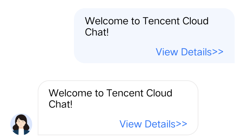 // 自定义消息 businessID(注意不能重复)#define BussinessID_TextLink @"text_link"/** 向 TUIChat 注册自定义消息。三个参数分别为* @param businessID 自定义消息 businessID* @param messagellClass 自定义消息 NSString 类型* @param messageCellDataClassName 自定义消息 NSString 类型*/- (void)registerCustomMessageCell {[TUIChatConfig.defaultConfig registerCustomMessage:BussinessID_TextLinkmessageCellClassName:@"TUILinkCell"messageCellDataClassName:@"TUILinkCellData"];}