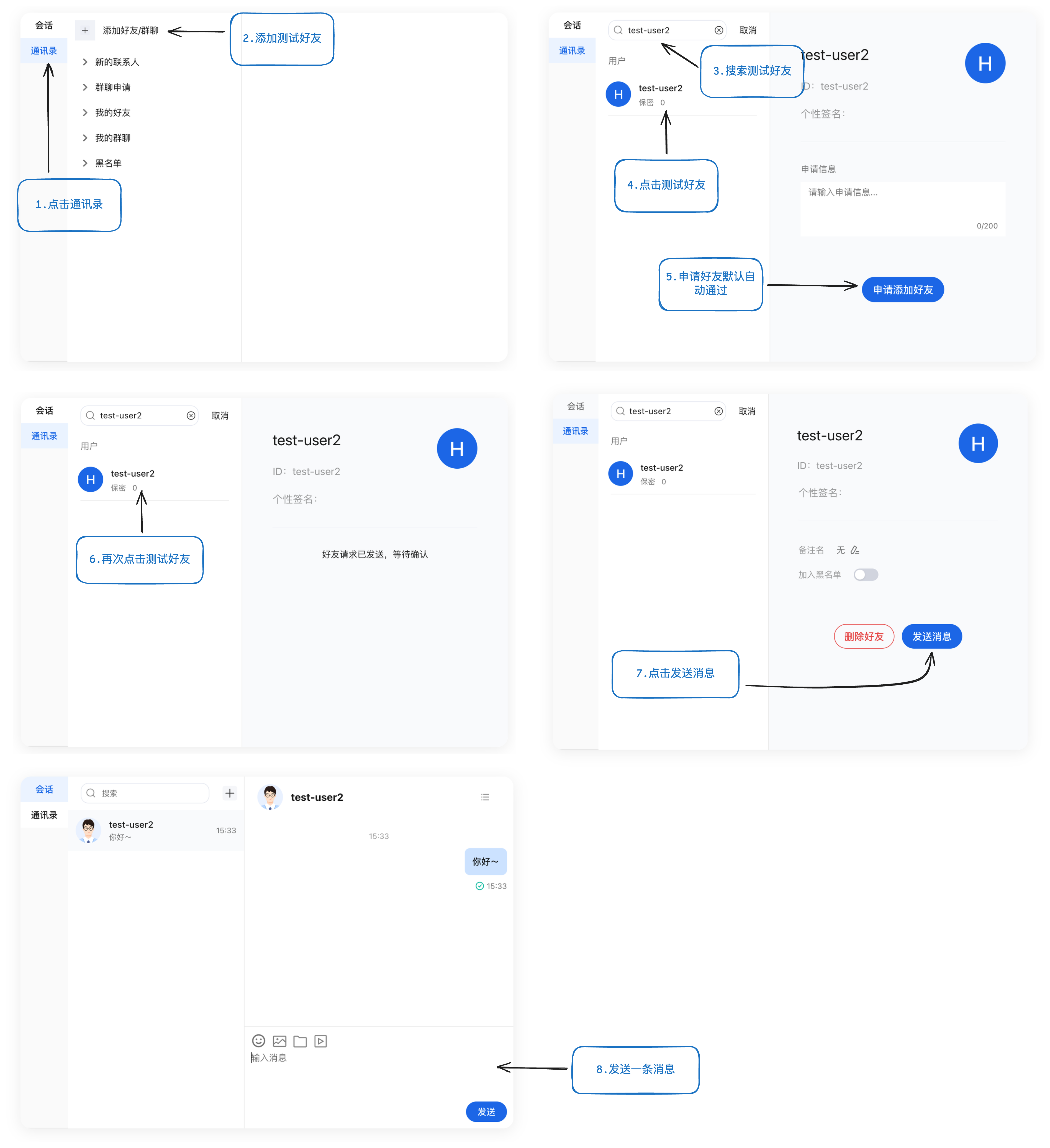 App.tsx 代码并替换原有的 App.tsx 中的内容。App.css 代码并替换同级目录的 App.css 样式文件。import {UIKitProvider,useLoginState,LoginStatus,ConversationList,Chat,ChatHeader,MessageList,MessageInput,ContactList,ContactInfo,useUIKit,useConversationListState,} from "@tencentcloud/chat-uikit-react";import { useEffect, useState } from "react";import './App.css';function App() {// 语言支持 en-US(default) / zh-CN / ja-JP / ko-KR / zh-TW// 主题支持 light(default) / darkreturn (<UIKitProvider theme={'light'} language={'en-US'}><ChatApp /></UIKitProvider>);}function ChatApp() {const [activeTab, setActiveTab] = useState('chats');const { language } = useUIKit();const texts = language === 'zh-CN'? { chats: '会话', contacts: '联系人', emptyTitle: '暂无会话', emptySub: '选择一个会话开始聊天', error: '请检查 SDKAppID, userID, userSig, 通过开发人员工具(F12)查看具体的错误信息', loading: '登录中...' }: { chats: 'Chats', contacts: 'Contacts', emptyTitle: 'No conversation', emptySub: 'Select a conversation to start chatting', error: 'Please check the SDKAppID, userID, and userSig. View the specific error information through the developer tools (F12).', loading: 'Logging in...'};const { status } = useLoginState({SDKAppID: 0, // type: numberuserID: '', // type: stringuserSig: '', // type: string})const { setActiveConversation } = useConversationListState();useEffect(() => {async function init() {// 你可以换成其他已创建的 userIDconst userID = 'administrator';const conversationID = `C2C${userID}`;setActiveConversation(conversationID);}if (status === LoginStatus.SUCCESS) {init();}}, [status]);if (status === LoginStatus.ERROR) {return (<div className="loading-container"><div className="loading-spinner"></div><div className="loading-text">{texts.error}</div></div>)}if (status !== LoginStatus.SUCCESS) {return (<div className="loading-container"><div className="loading-spinner"></div><div className="loading-text">{texts.loading}</div></div>)}return (<div className="chat-app"><ul className="vertical-tabs"><liclassName={`tab-item ${activeTab === 'chats' ? 'active' : ''}`}onClick={() => {setActiveTab('chats')}}>{texts.chats}</li><liclassName={`tab-item ${activeTab === 'contacts' ? 'active' : ''}`}onClick={() => {setActiveTab('contacts')}}>{texts.contacts}</li></ul>{activeTab === 'chats' && (<><ConversationList style={{ flex: '0 0 300px'}}/><ChatclassName="chat-box"PlaceholderEmpty={<div className="empty-chat"><div className="empty-icon">💬</div><div className="empty-title">{texts.emptyTitle}</div><div className="empty-subtitle">{texts.emptySub}</div></div>}><ChatHeader /><MessageList /><MessageInput /></Chat></>)}{activeTab === 'contacts' && (<><ContactList style={{ flex: '0 0 300px'}}/><ContactInfostyle={{ flex: '1'}}onSendMessage={() => {setActiveTab('chats')}}onEnterGroup={() => {setActiveTab('chats')}}/></>)}</div>);}export default App;