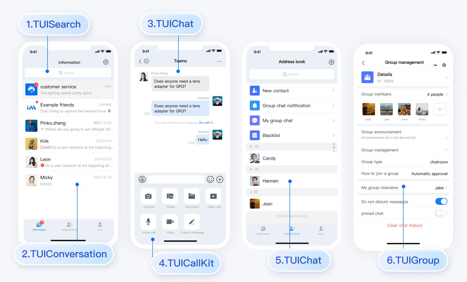 TUIKit 是基于腾讯云 Chat SDK 的一款 UI 组件库,它提供了一些通用的 UI 组件,包含会话、聊天、搜索、关系链、群组、音视频通话等功能。