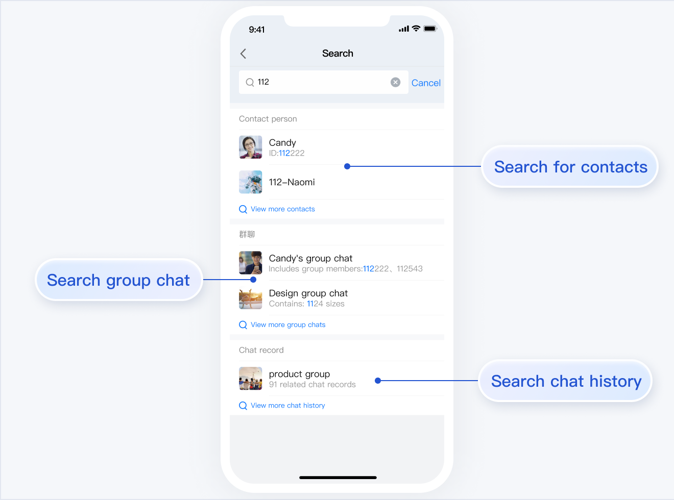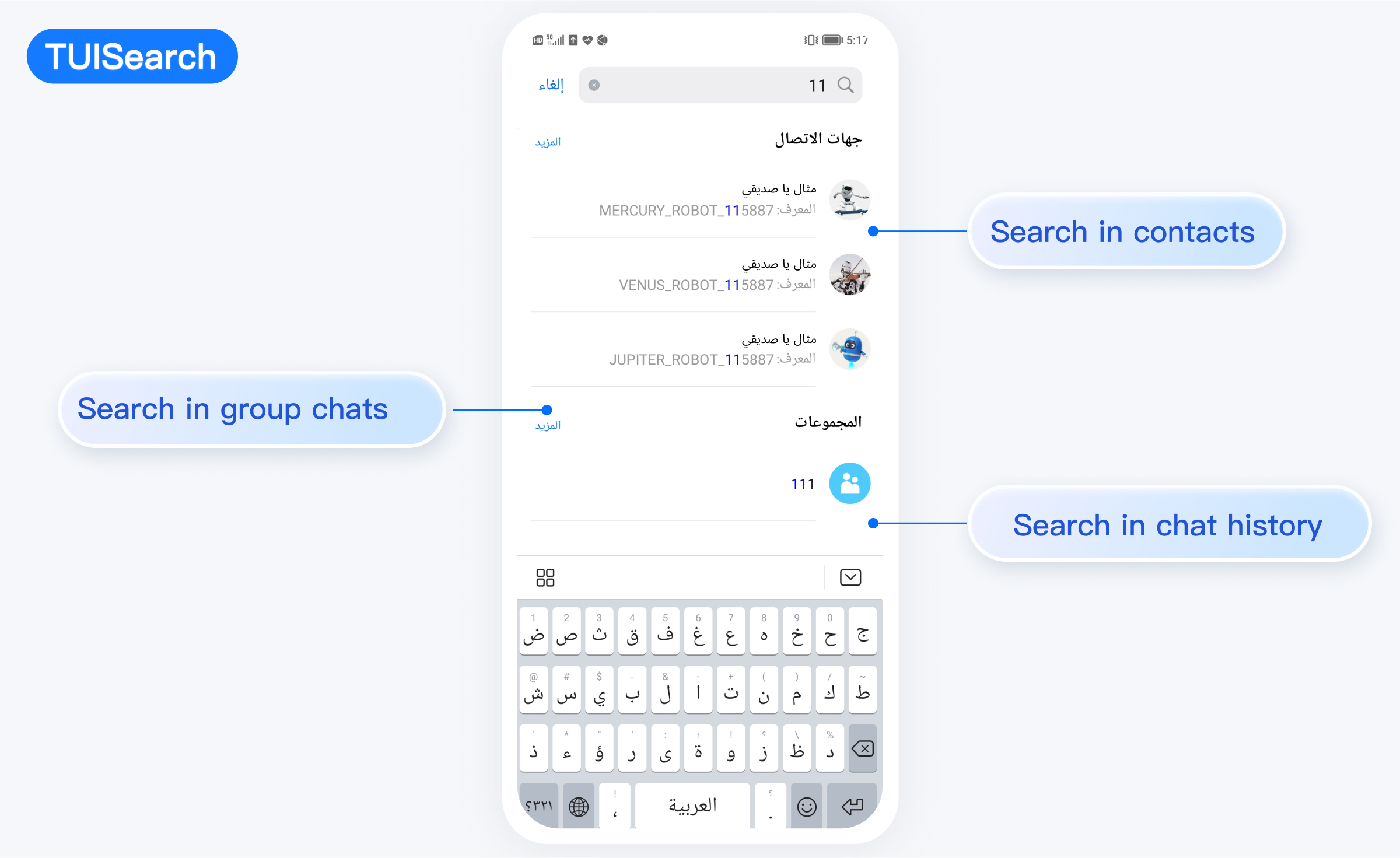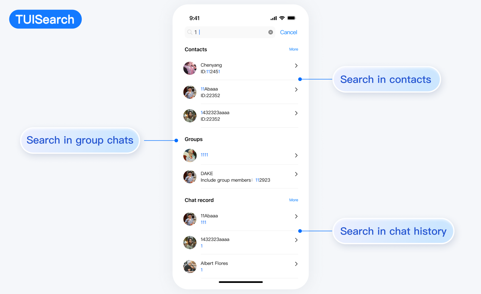 TUISearch 主要负责本地搜索,支持搜索联系人、群聊、聊天记录。
