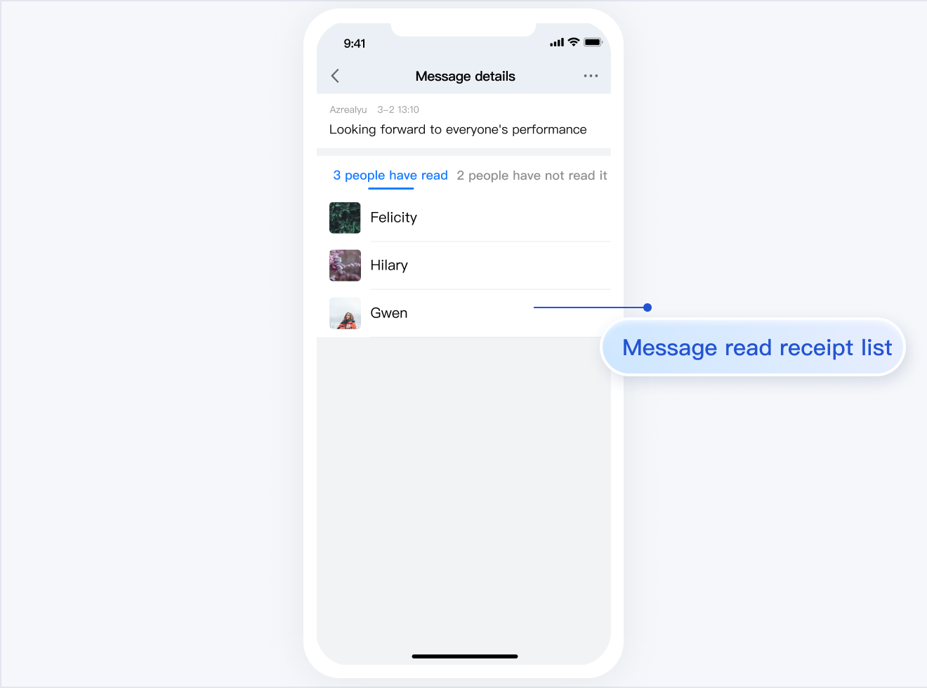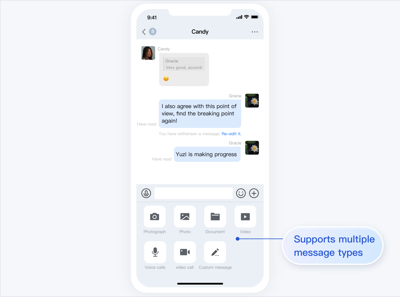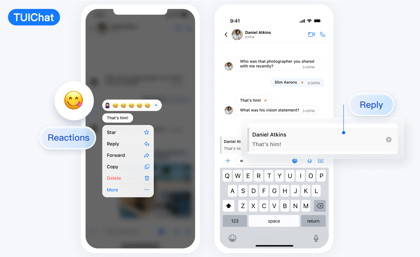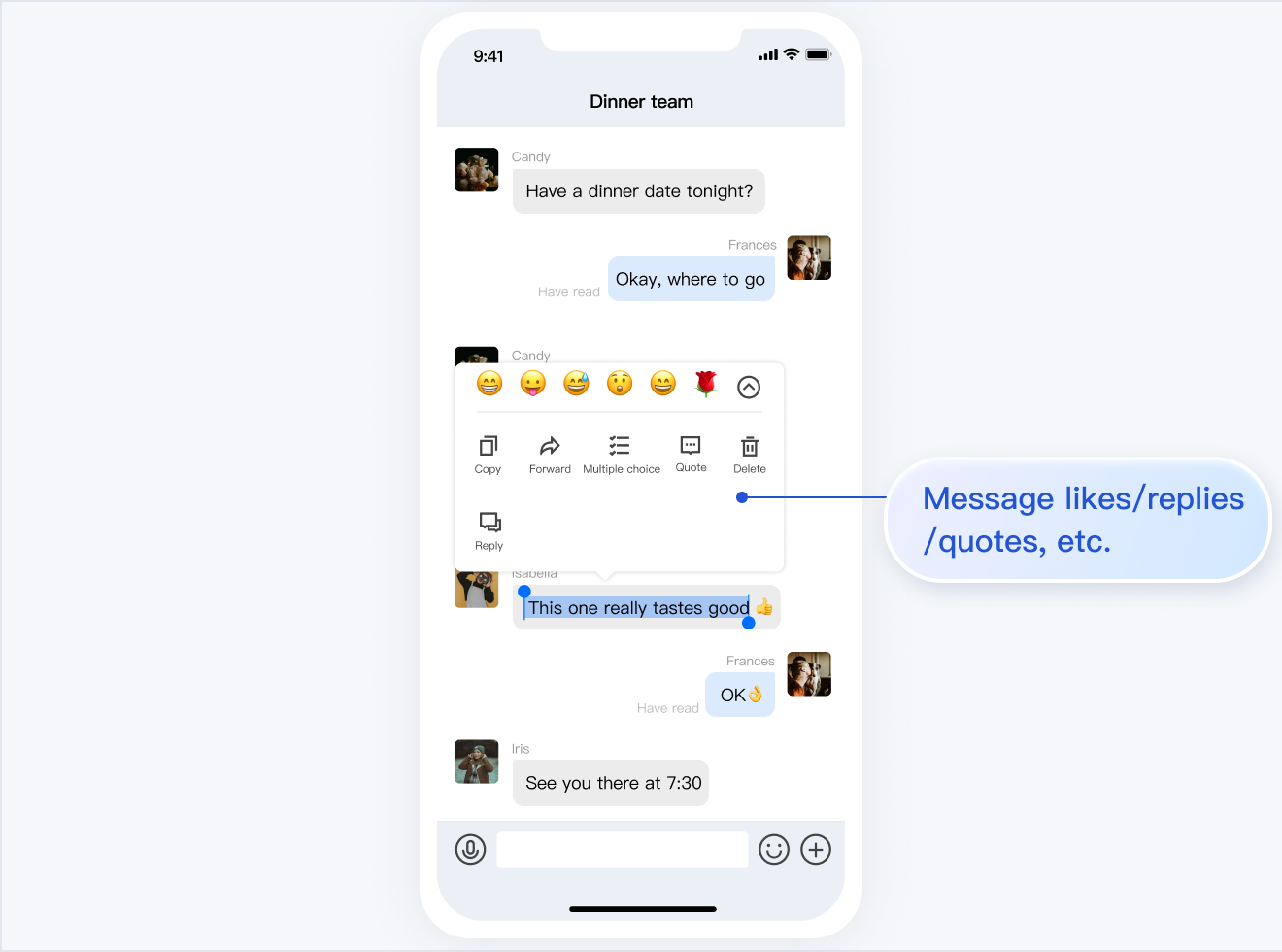 TUIChat 主要负责消息界面的展示。您还可以利用它直接发送不同类型的消息、对消息长按点赞/回复/引用、查询消息已读回执详情等。