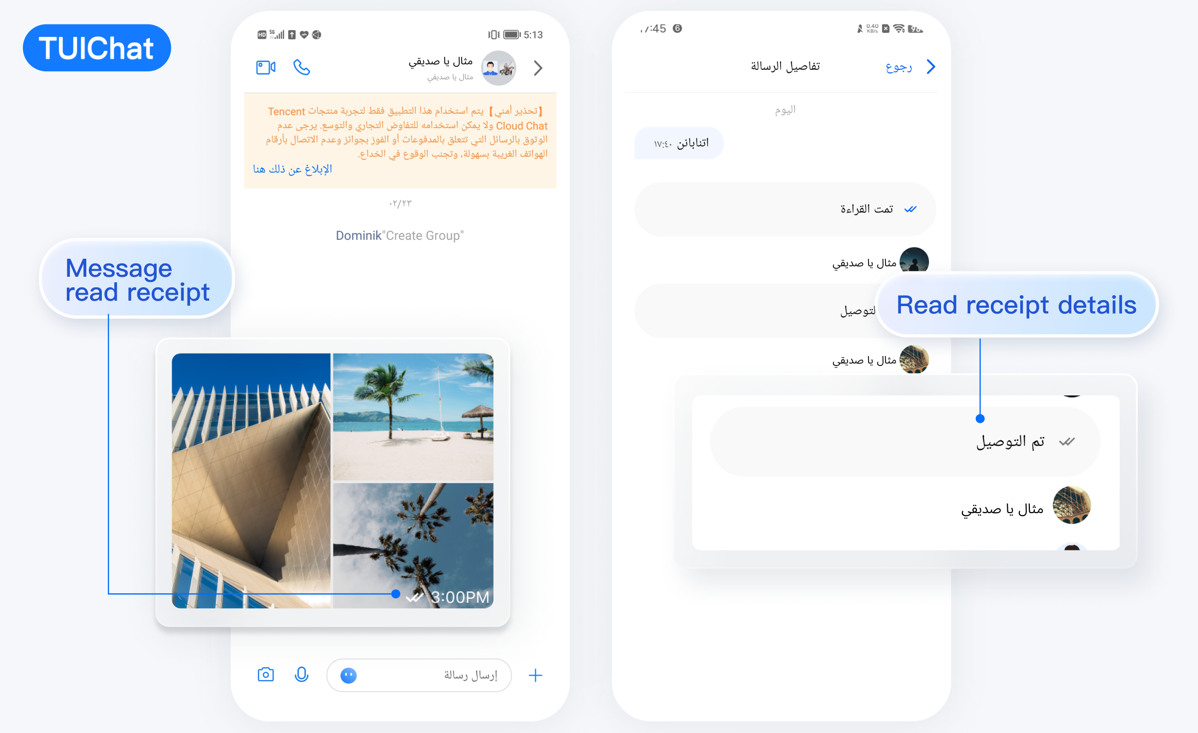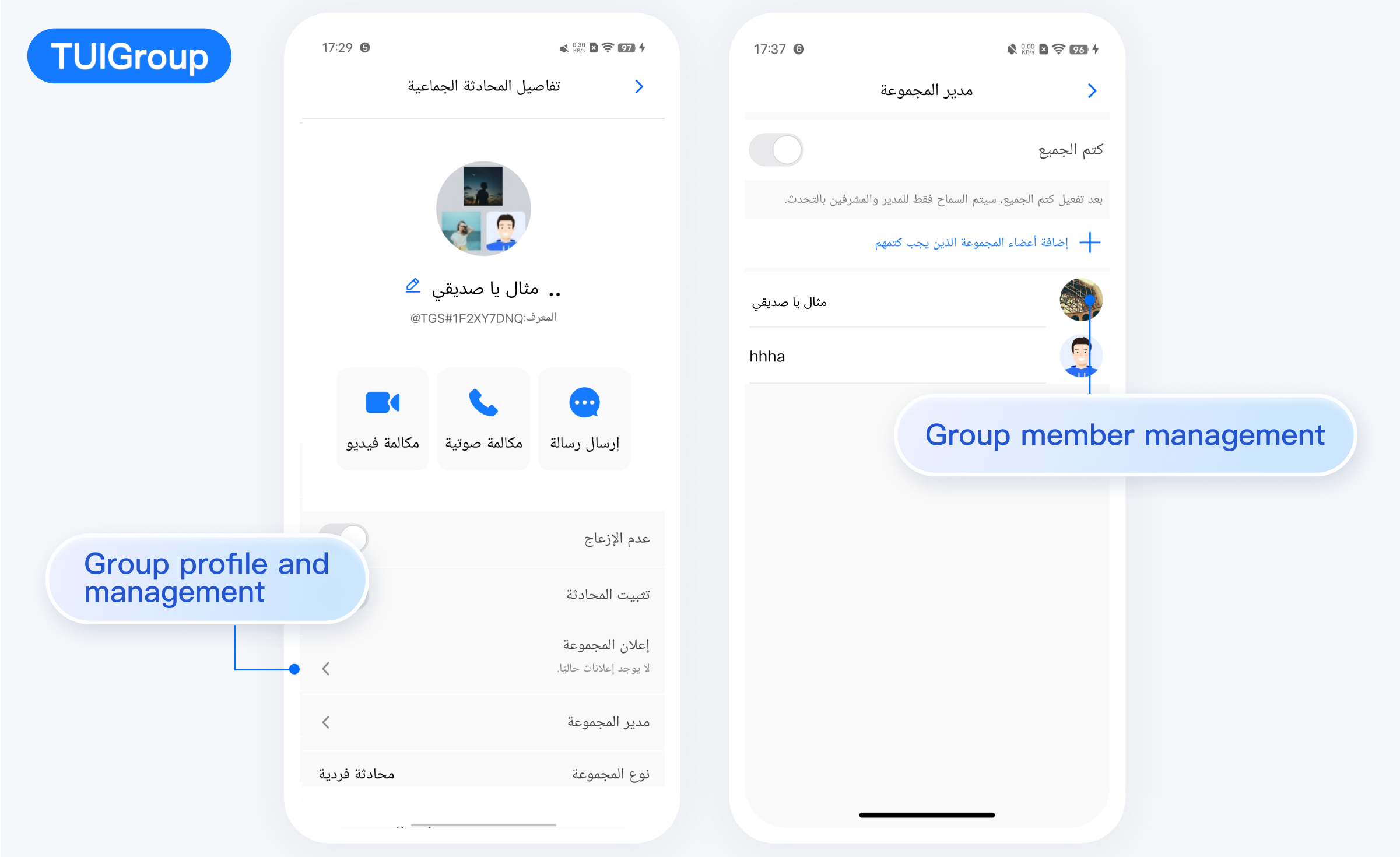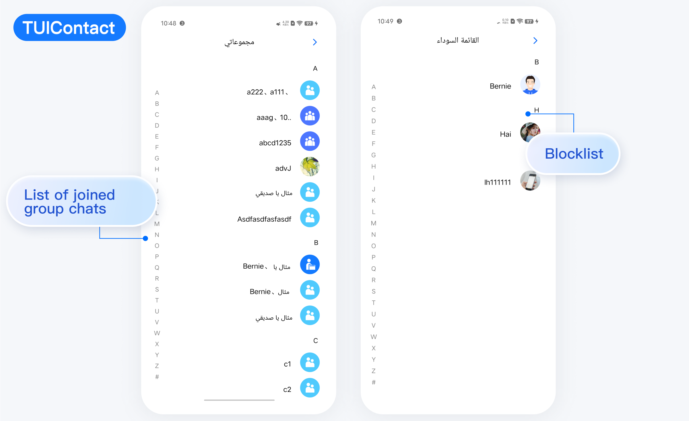 TUIKit 从 7.5.4852 版本开始新增了 RTL 语言(文字方向从右到左的语言,比如阿拉伯语、希伯来语等)支持,当应用内语言为 RTL 语言时,TUIKit 会自动切换到 RTL 样式;同时内置语言新增了阿拉伯语。