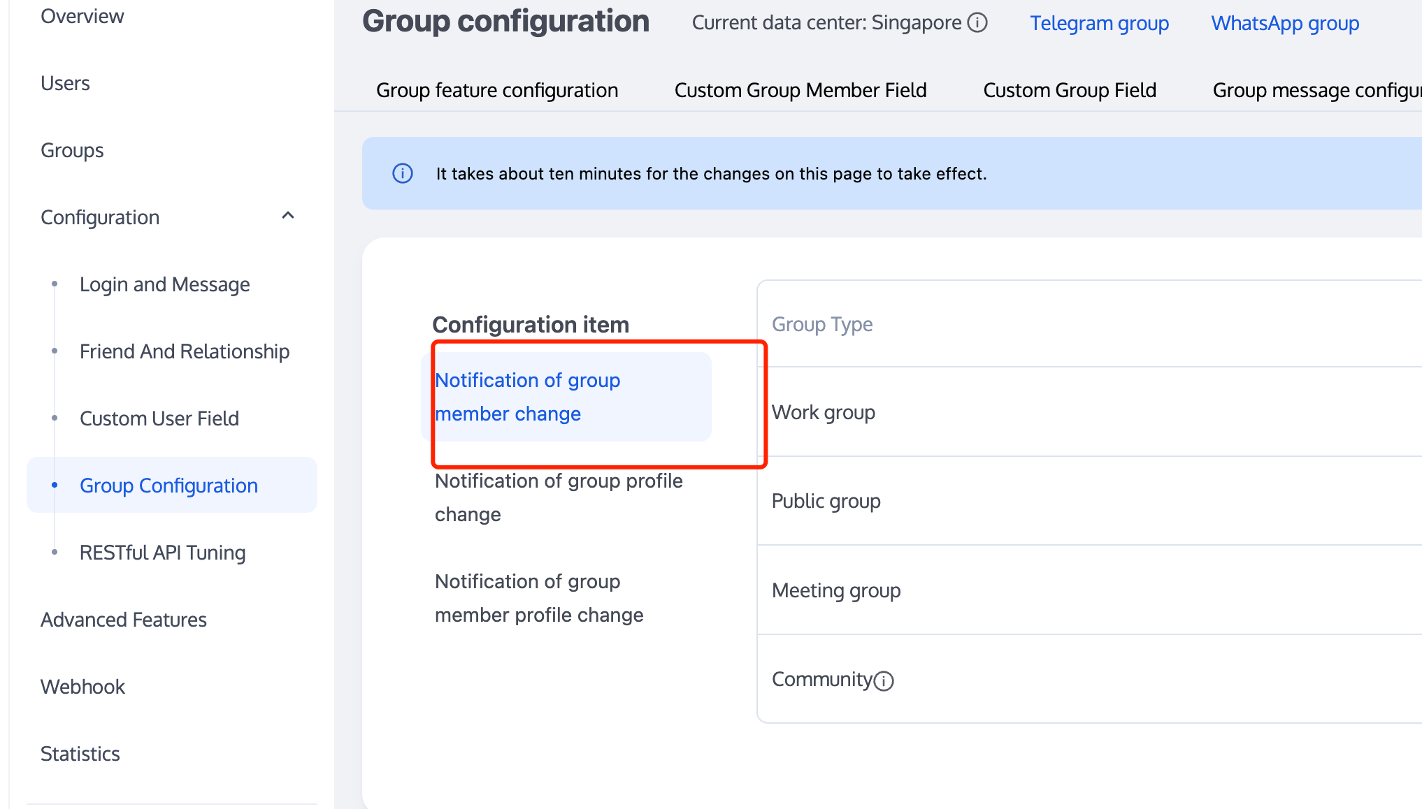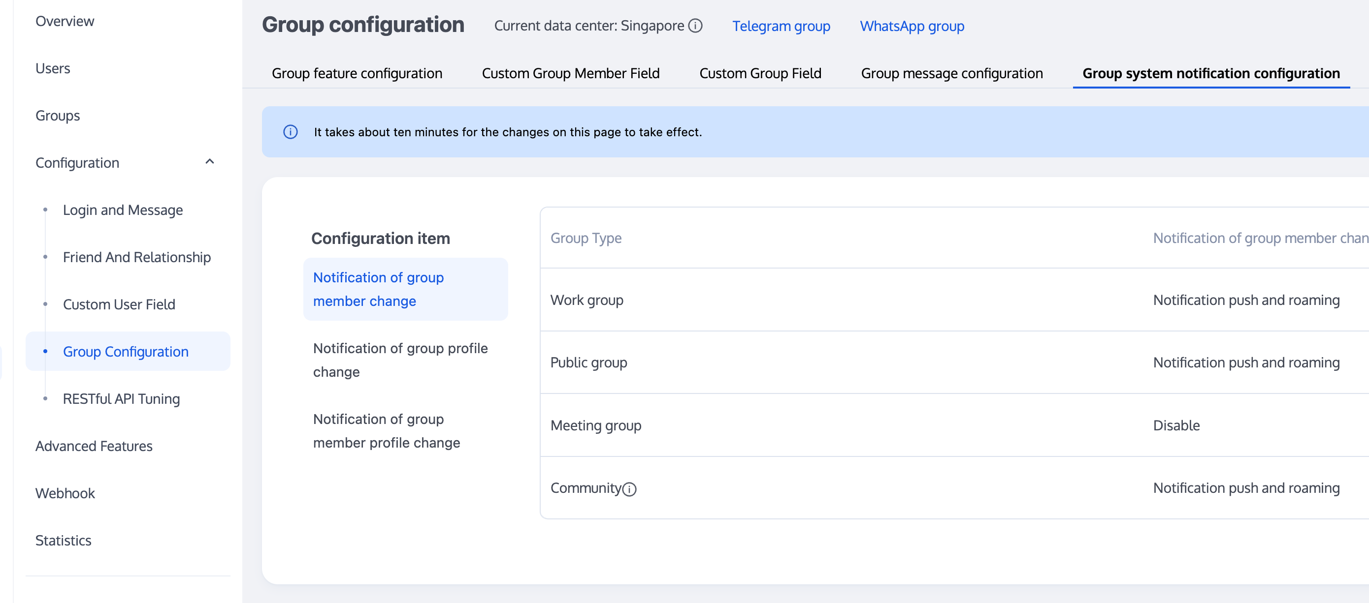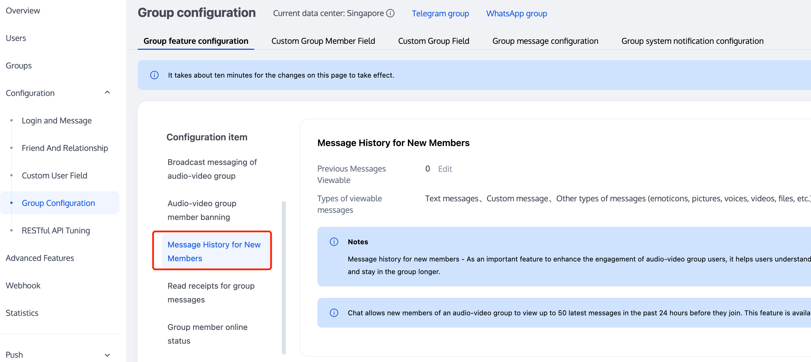 tim.setGroupMemberMuteTime(options);let promise = tim.setGroupMemberMuteTime({groupID: 'group1',userID: 'user1',muteTime: 600 // 禁言10分钟;设为0,则表示取消禁言});promise.then(function(imResponse) {console.log(imResponse.data.group); // 修改后的群资料console.log(imResponse.data.member); // 修改后的群成员资料}).catch(function(imError) {console.warn('setGroupMemberMuteTime error:', imError); // 禁言失败的相关信息});// 设置群成员在话题中的禁言时间let promise = tim.setGroupMemberMuteTime({groupID: 'topicID',userID: 'user1',muteTime: 600 // 禁言10分钟;设为0,则表示取消禁言});promise.then(function(imResponse) {console.log(imResponse.data.group); // 修改后的群资料console.log(imResponse.data.member); // 修改后的群成员资料}).catch(function(imError) {console.warn('setGroupMemberMuteTime error:', imError); // 禁言失败的相关信息});// v2.6.2 起,提供了全体禁言和取消禁言的功能。目前群全体禁言后,不支持下发群提示消息。let promise = tim.updateGroupProfile({groupID: 'group1',muteAllMembers: true, // true 表示全体禁言,false表示取消全体禁言});promise.then(function(imResponse) {console.log(imResponse.data.group) // 修改成功后的群组详细资料}).catch(function(imError) {console.warn('updateGroupProfile error:', imError); // 修改群组资料失败的相关信息});