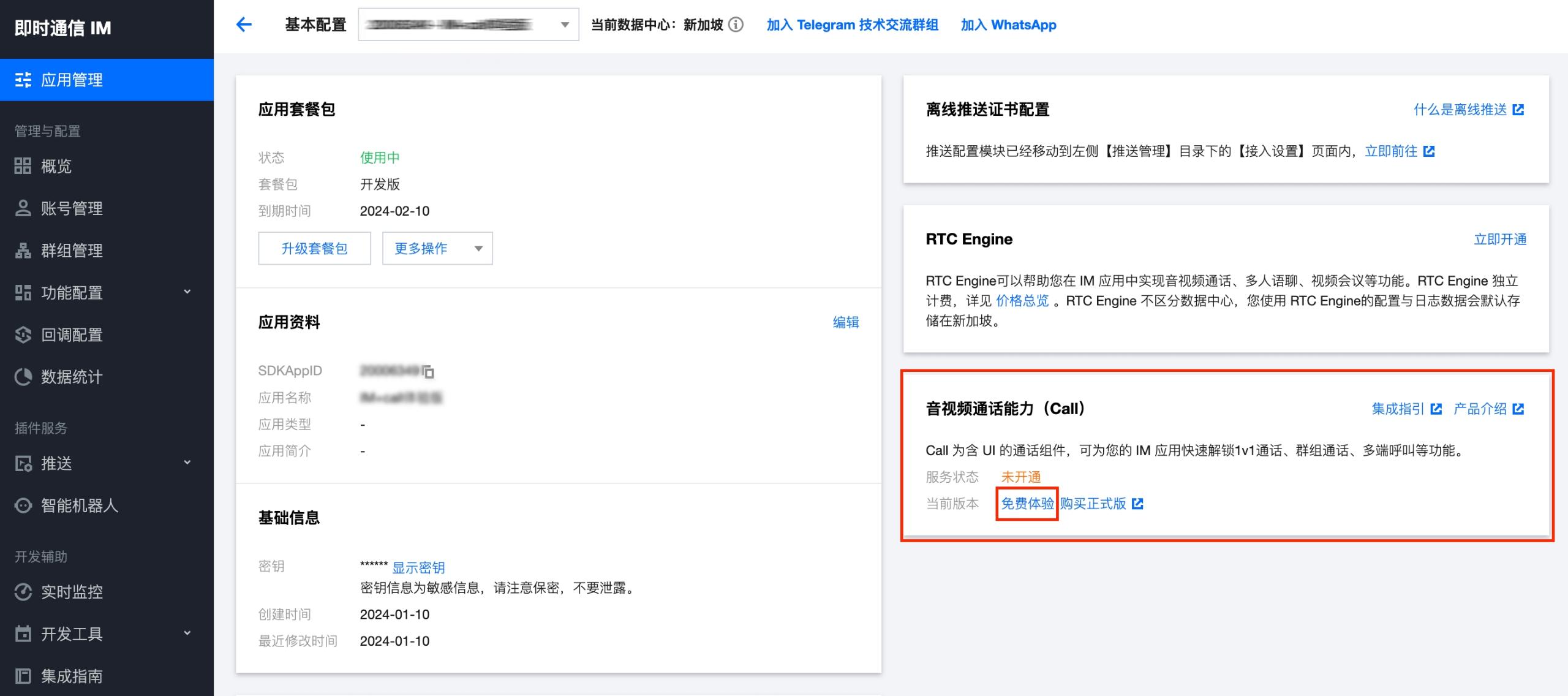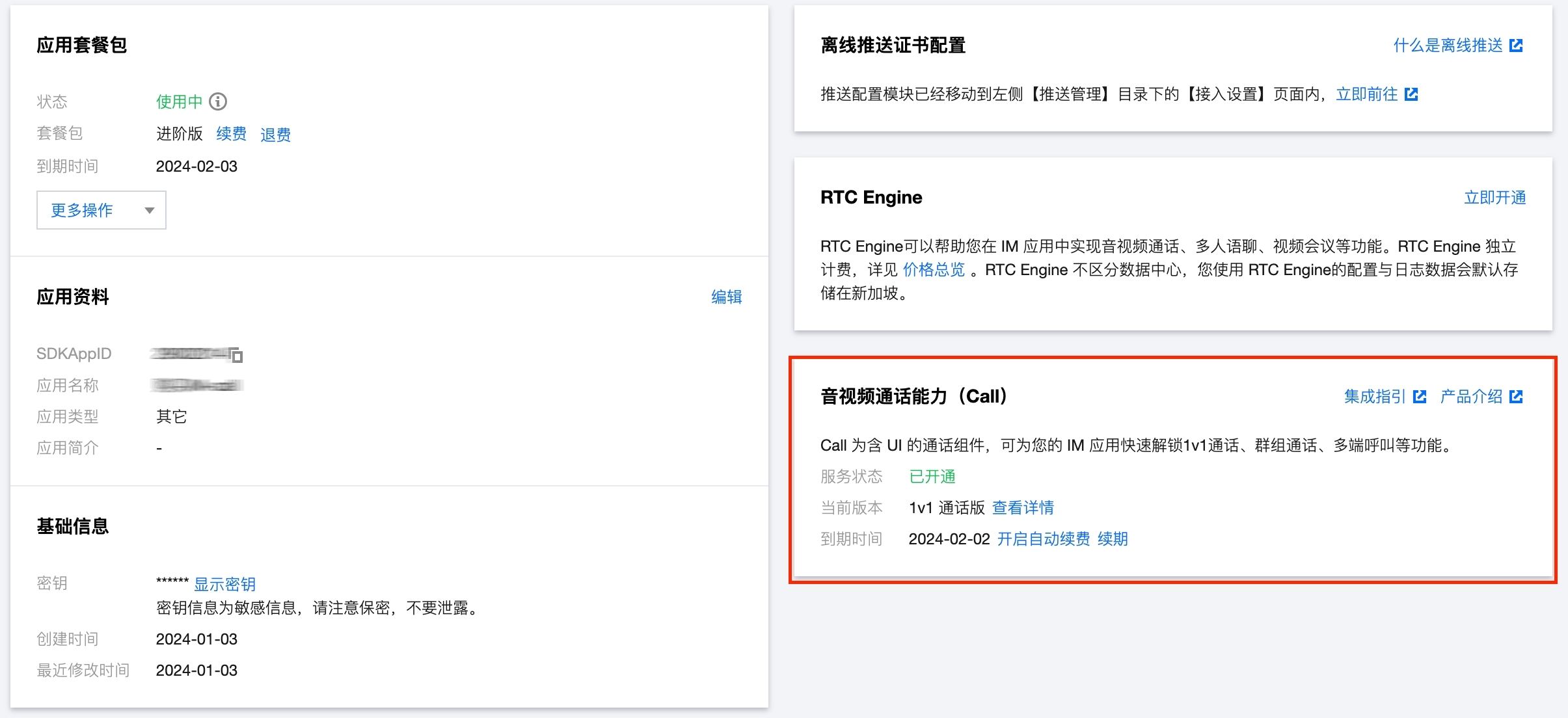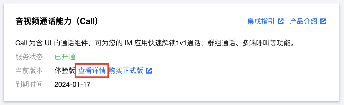 6. 购买完成后,您可回到 即时通信 Chat 控制台,单击目标应用卡片,进入应用的基础配置页面。在音视频通话能力(Call)卡片中查看当前版本信息。开通完成后即可参见 集成指引 进行集成。 续费正式版