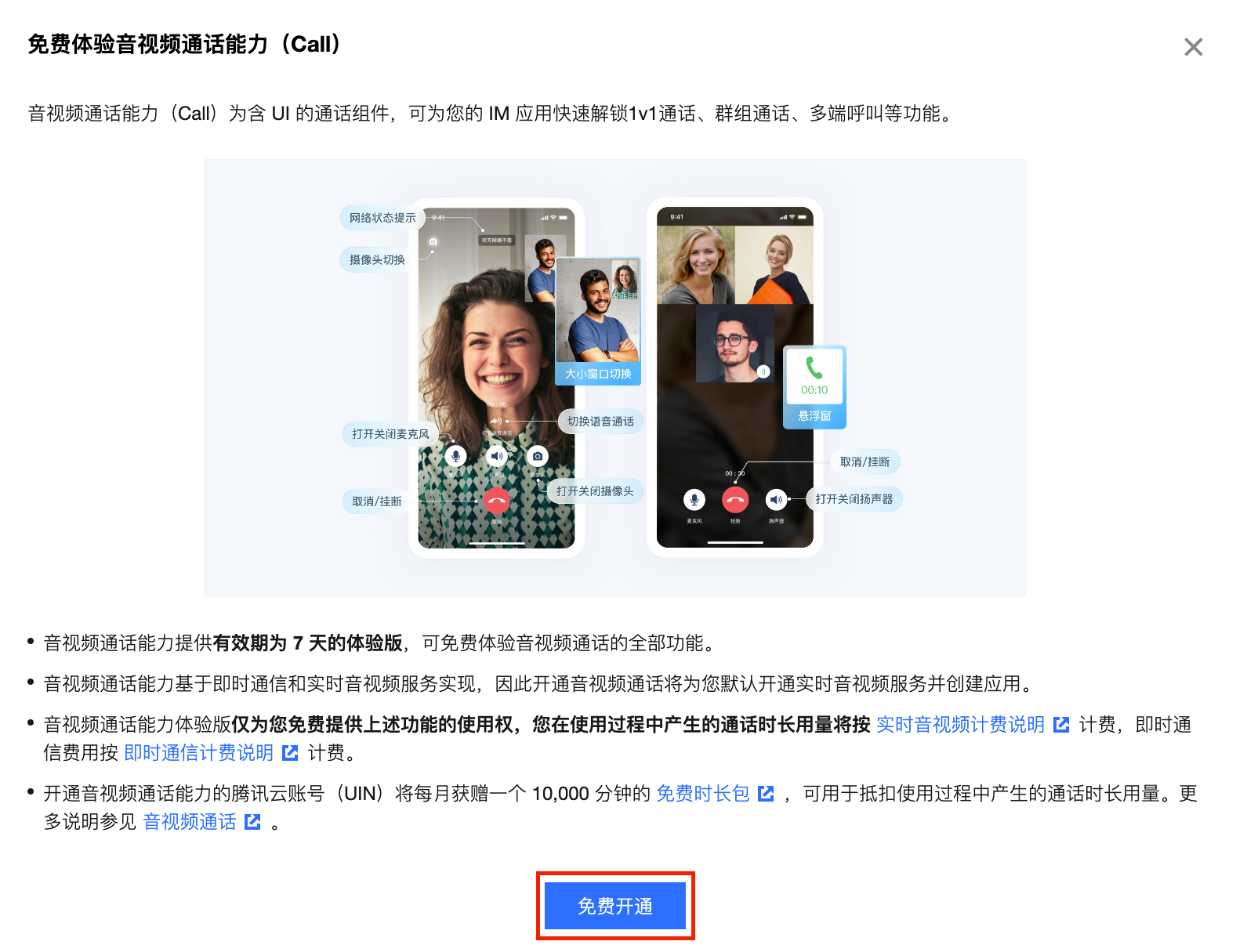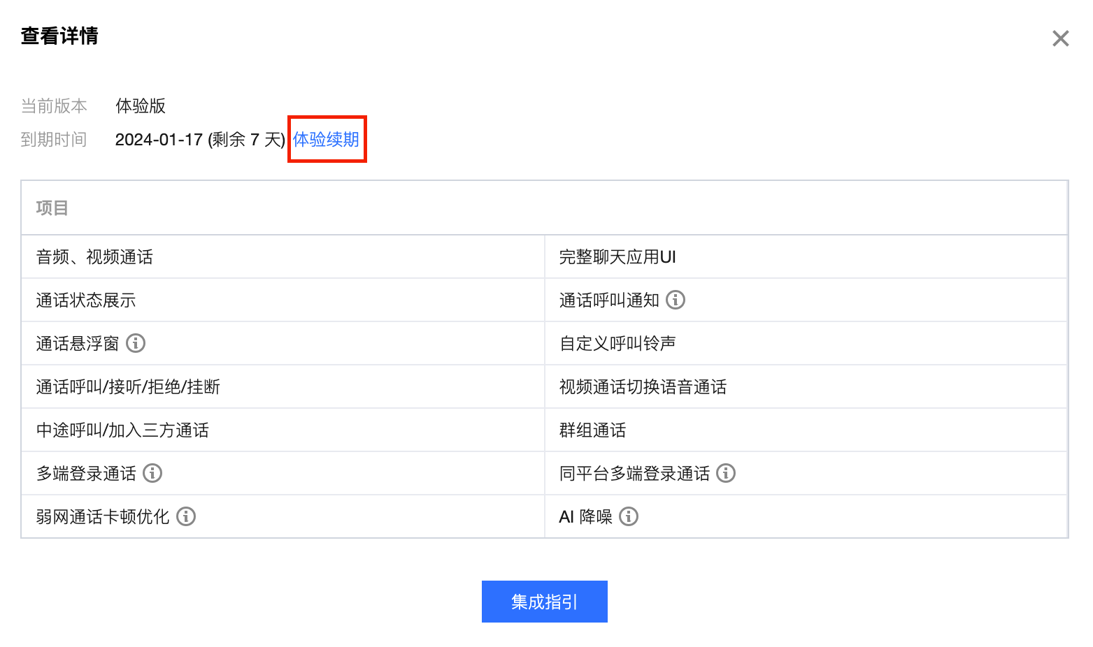 3. 确认弹窗内容后,单击免费开通,即可成功开通音视频通话体验版。开通完成后即可参见 集成指引 进行集成。 4. 若您当前 SDKAppID 领取的体验版尚未到期,您可在音视频通话能力(Call)卡片中单击查看详情,在查看详情弹窗中单击体验续期,即可直接使用第二次体验机会,此时体验版有效期将延长7天。