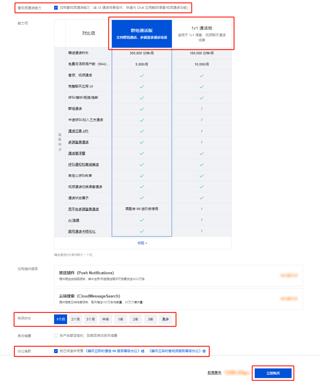 3. 若您当前 Chat 应用已为标准版/专业版、专业版Plus、企业版,可跳过该步骤;否则您需要先选择您所需要的 Chat 套餐包,Chat 基础套餐包区别可参见 基础服务详情 。 4. 勾选音视频通话能力,并在能力项中选择所需的音视频通话(Call)版本。选择购买时长,推荐您可以勾选自动续费,套餐包到期后无需操作即可自动为您按月续费。