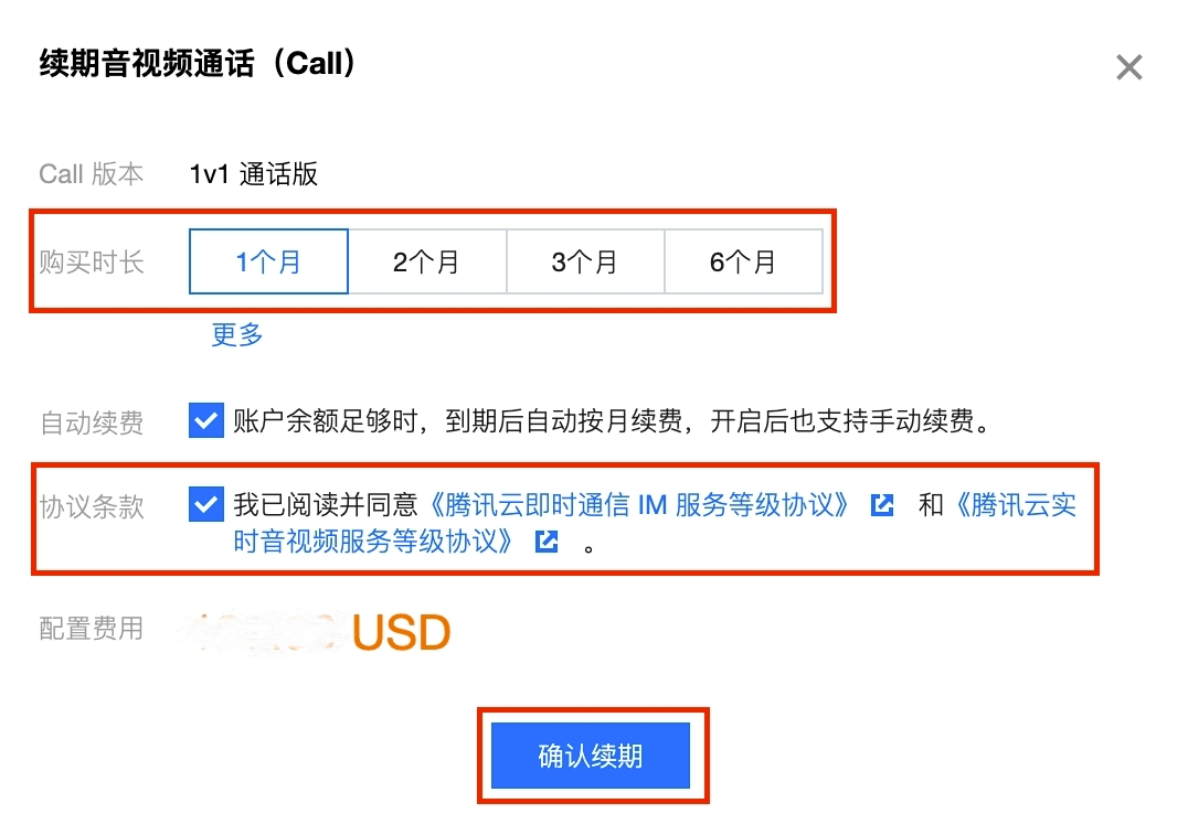 3. 在弹出的购买弹窗选择购买时长。请确认您已知晓并同意相关协议条款后,勾选协议条款,单击确认续期进行购买。