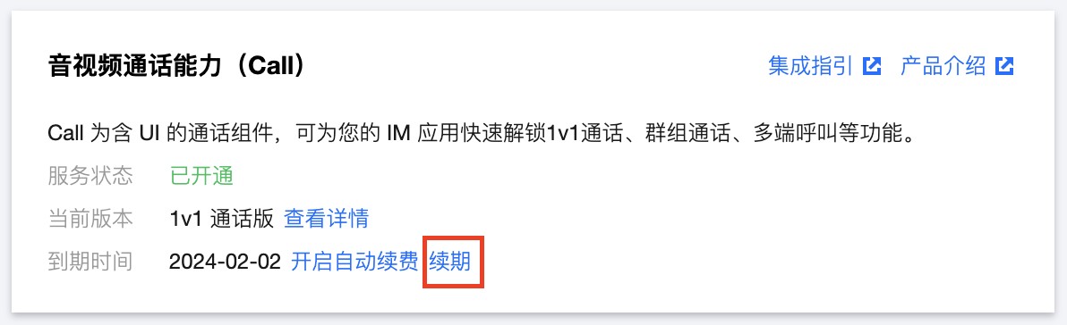 2. 找到音视频通话能力(Call)功能区,单击续期。