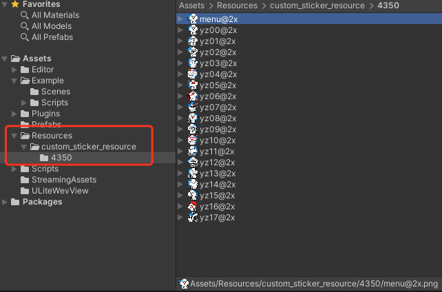 // 生成表情包列表,StickerPackage 为一组表情包List<StickerPackage> stickers = new List<StickerPackage> {new StickerPackage {name = "4350",baseUrl = "custom_sticker_resource/4350", //Resource 文件夹内相对路径menuItem = new StickerItem { // 表情栏表情项目name = "menu@2x",index = 0,},stickerList = new List<StickerItem> { // 表情包项目组new StickerItem { // 具体表情包数据name = "menu@2x",index = 0 // 表情包顺序},}}};