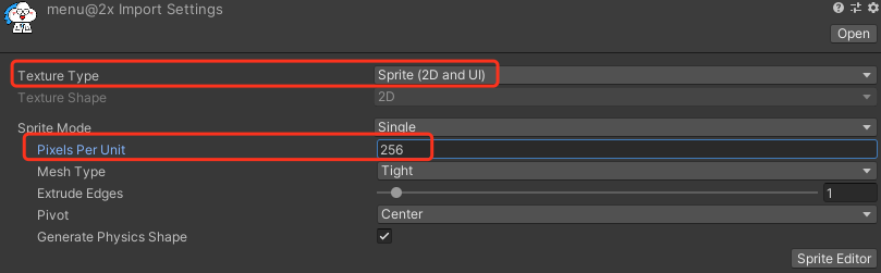 Texture Type 为 Sprite (2D and UI),并根据图片尺寸修改 Pixels Per Unit: