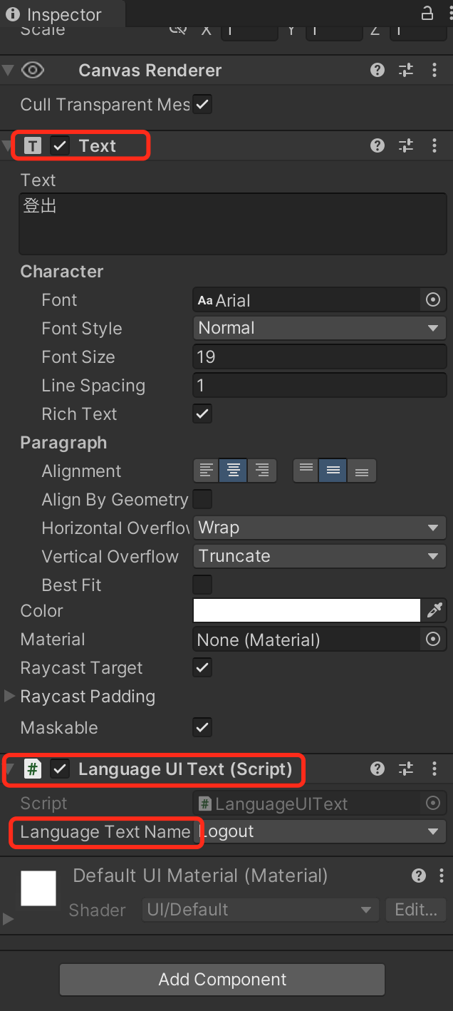 LanguageUIText(Script) component,将需要显示的词的Key选中。改显示的Key对应LanguageTextName中的enum和词汇文件里的Key。