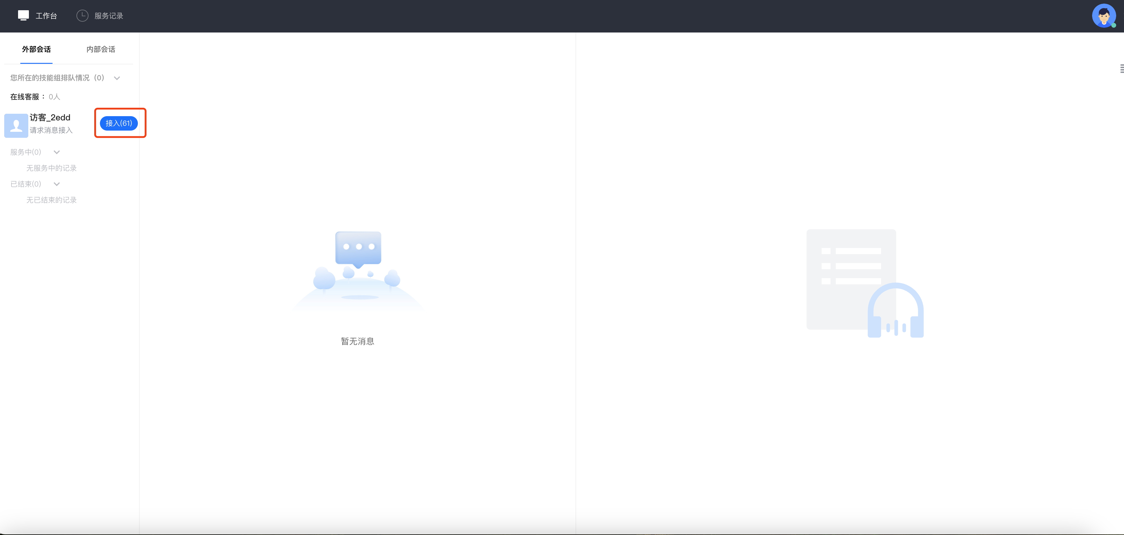当有会话分配到客服时,客服工作台将弹出接待提示条以及铃音提示客服有新的会话,客服可单击蓝色按钮接待。