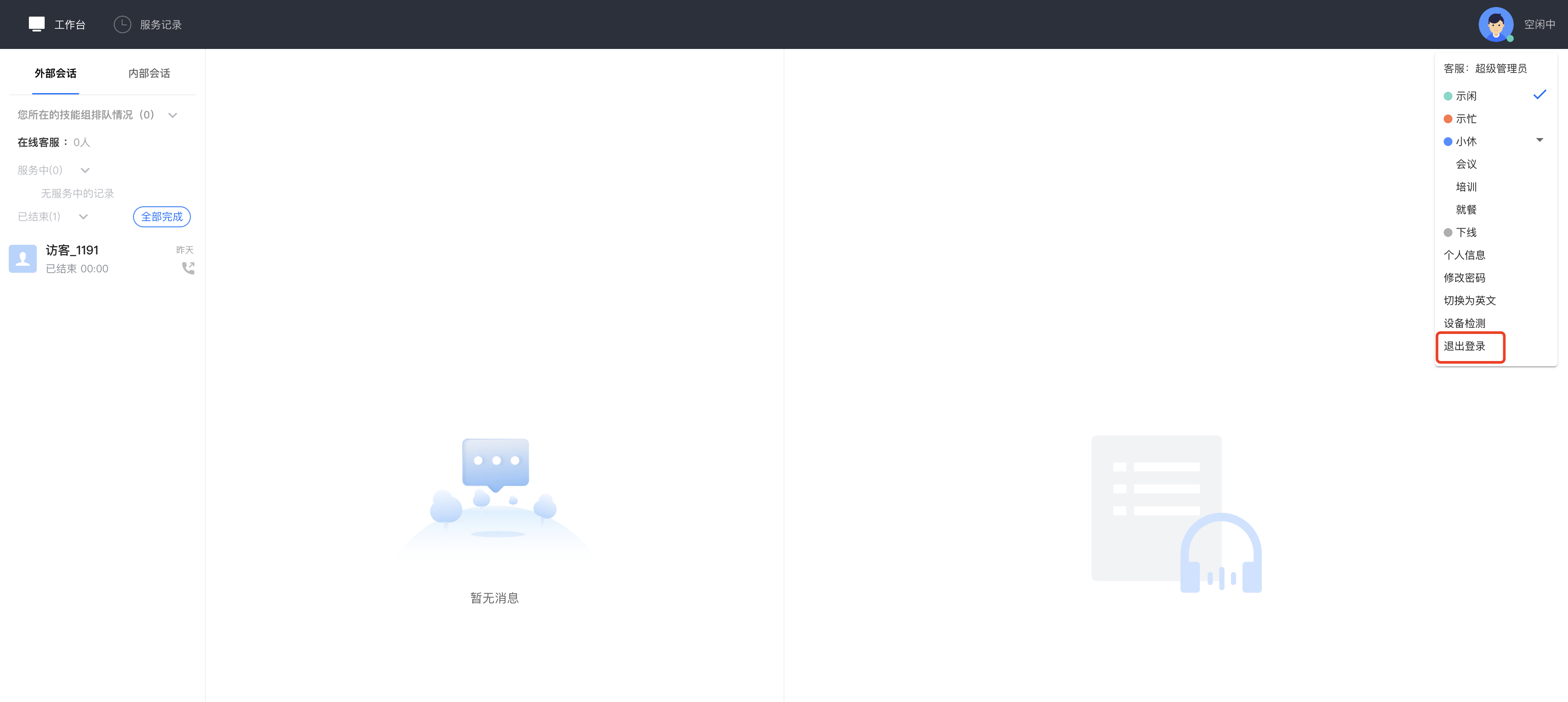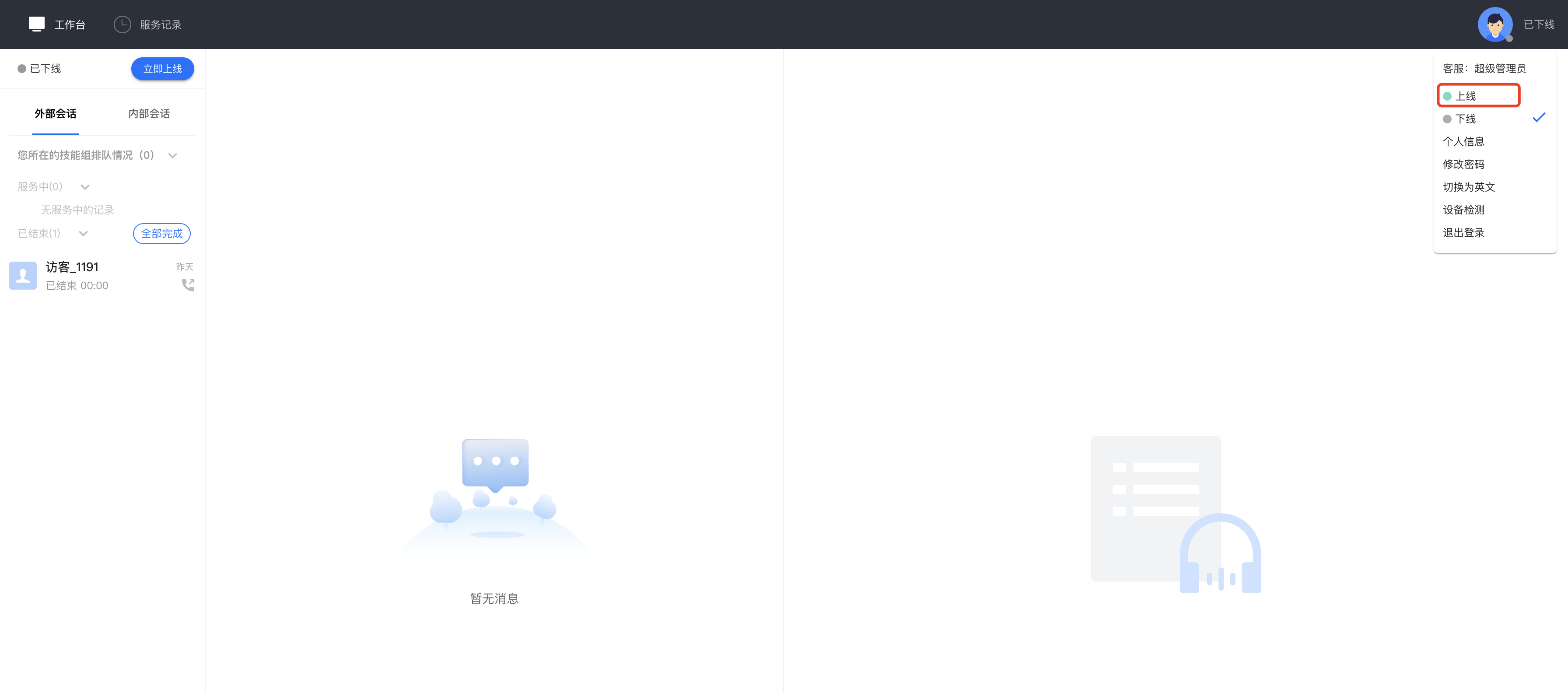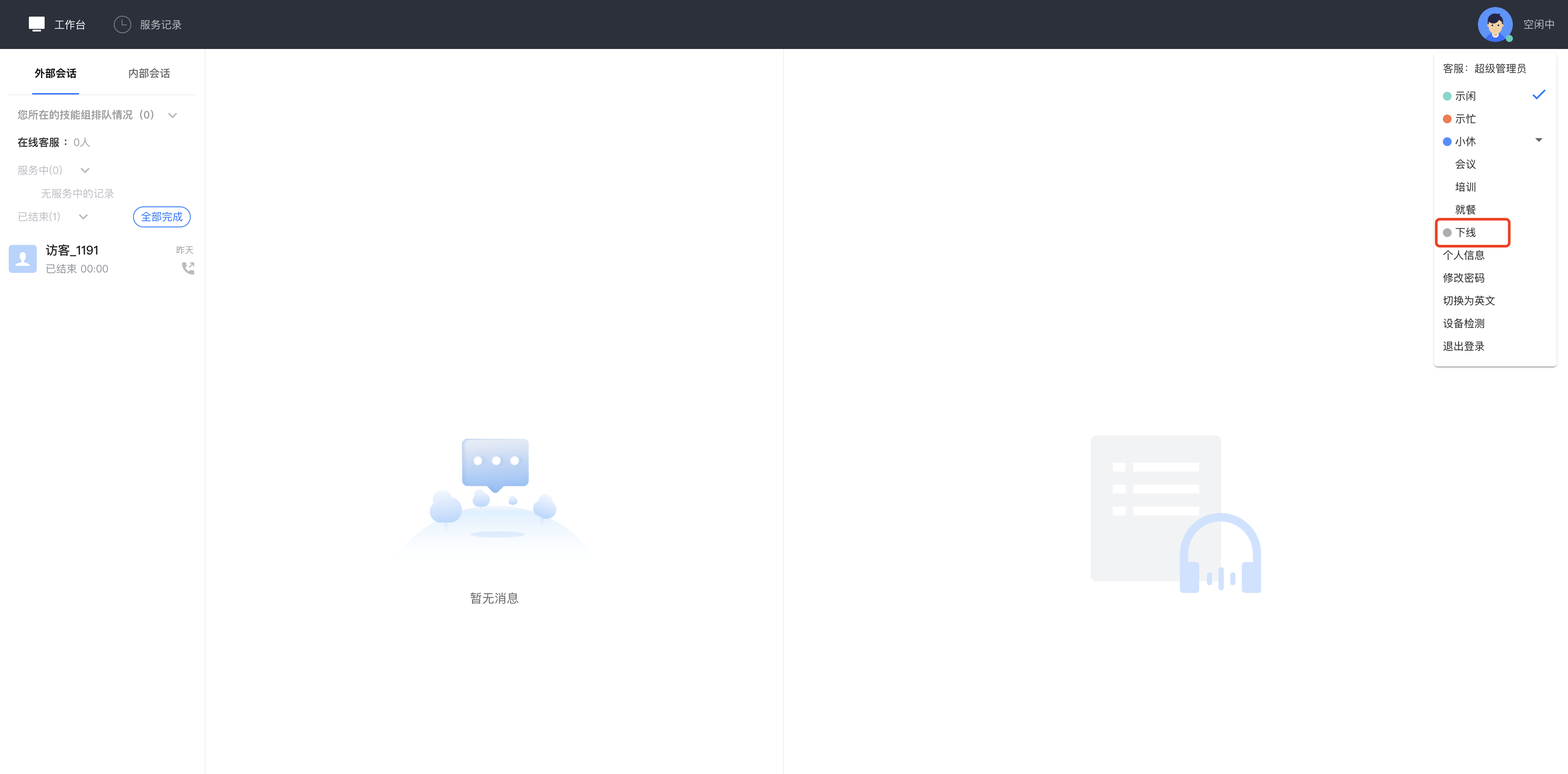 下线后,客服状态为离线状态,系统不会给该客服分配会话,客服可单击