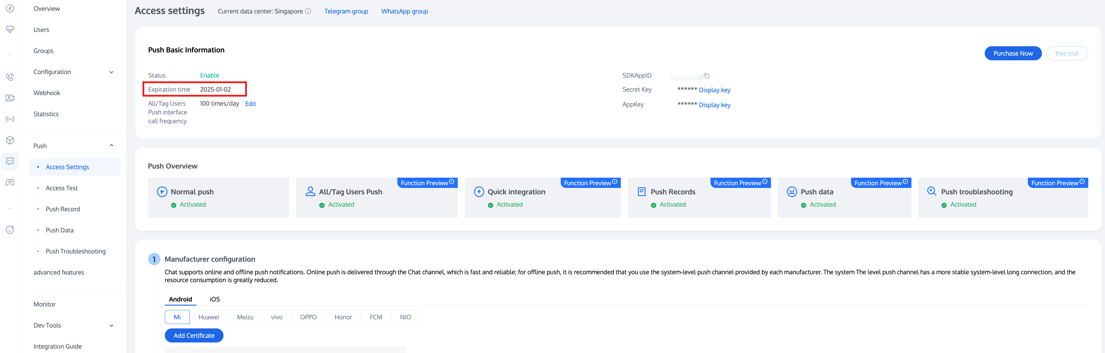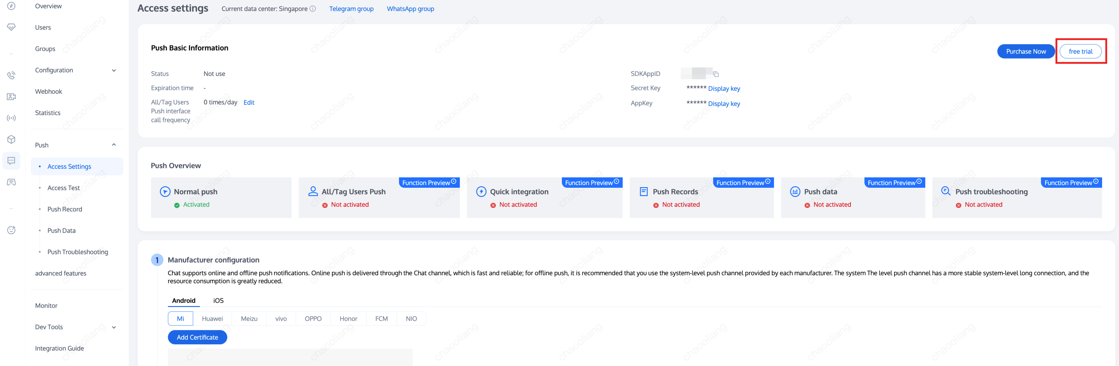 您可以在 Chat 控制台中开通推送服务(Push)体验版,具体操作步骤如下: