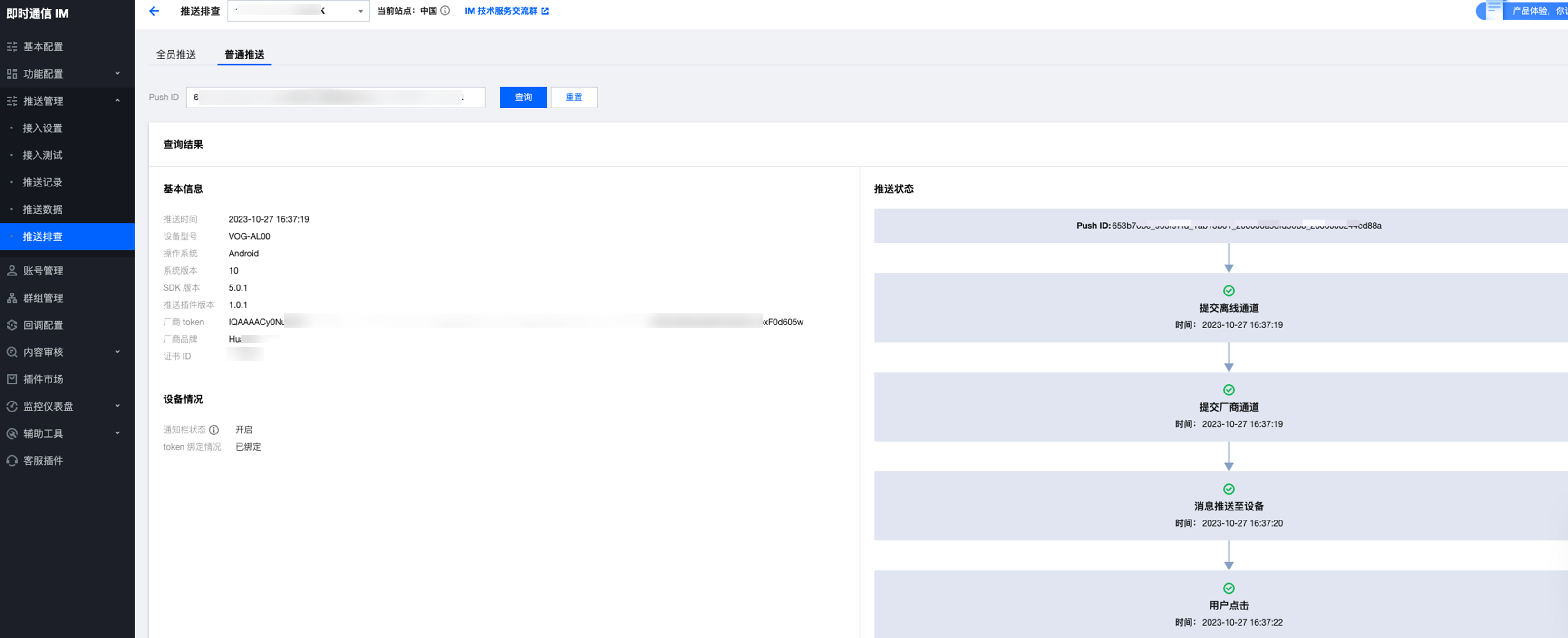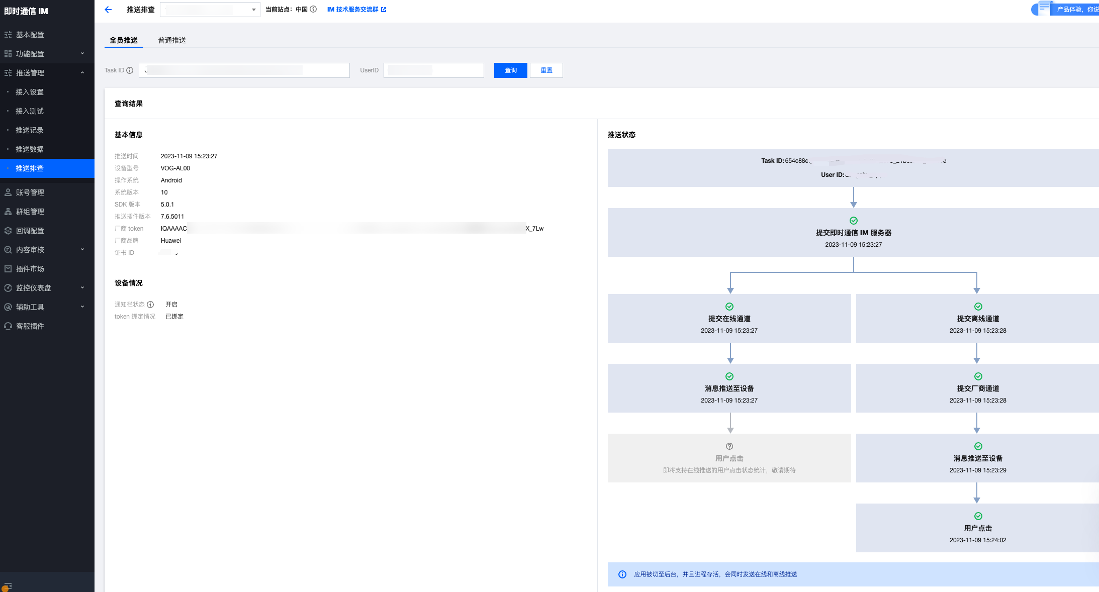 推送状态:该条推送针对指定 UserID 用户下发的全链路信息,包含 Chat 服务器 > 厂商服务器 > 终端设备 > 用户点击的整个链路情况。