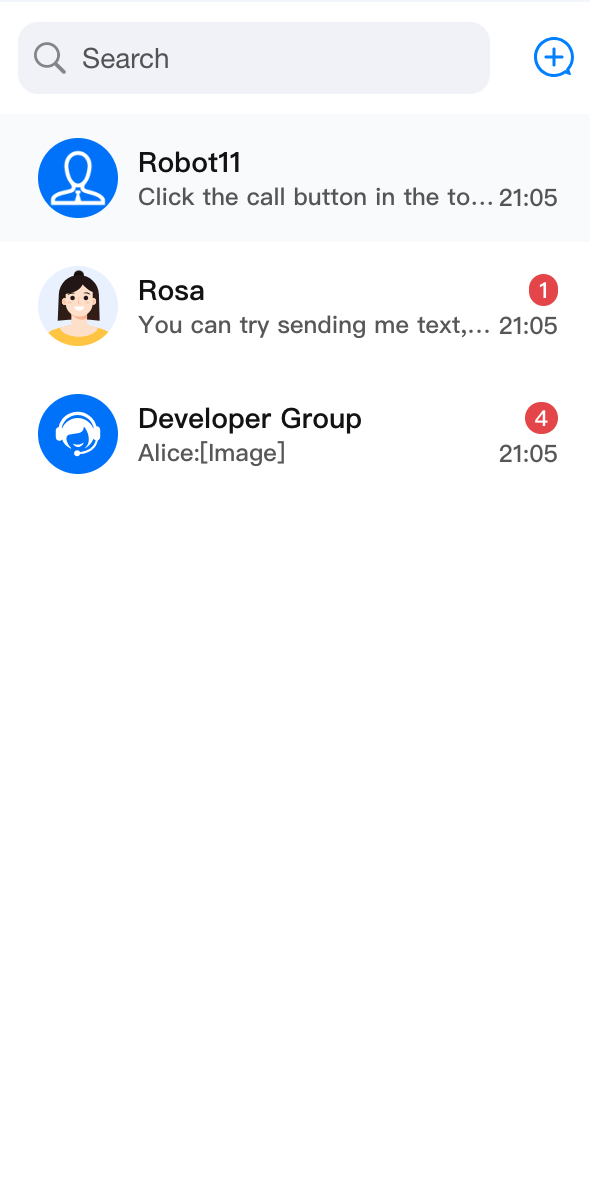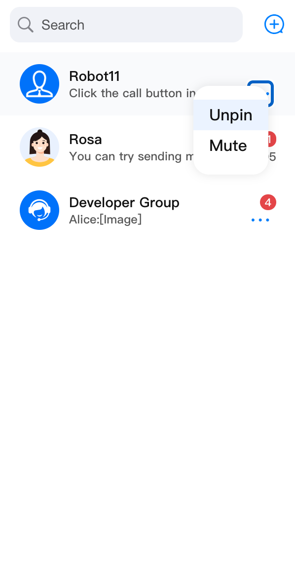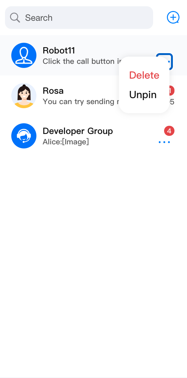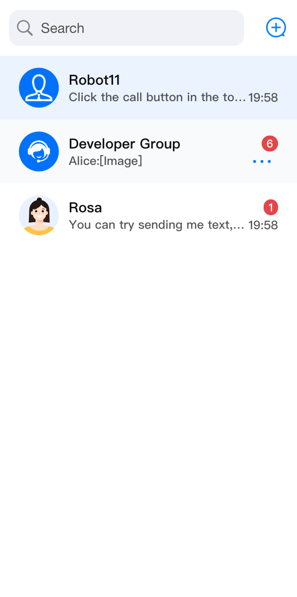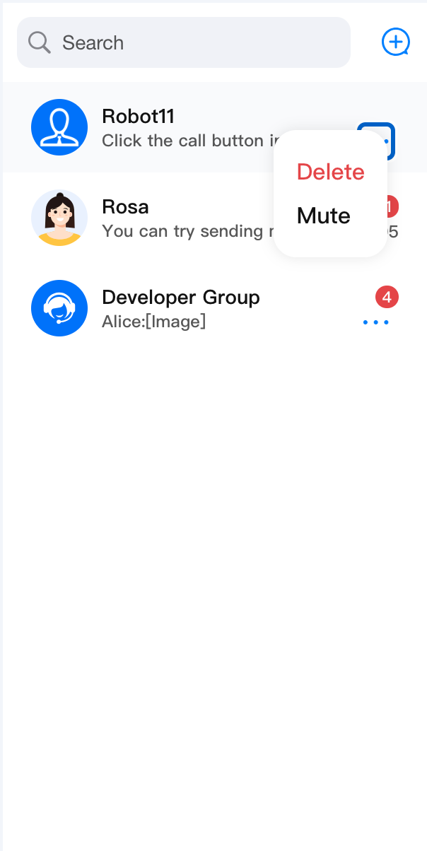 ConversationList 组件主要负责会话列表功能,它包含了 Header 部分和 List 部分,具有搜索会话、创建会话、会话置顶、会话删除等功能。会话列表 | 会话操作 | 会话搜索 | 创建会话 |