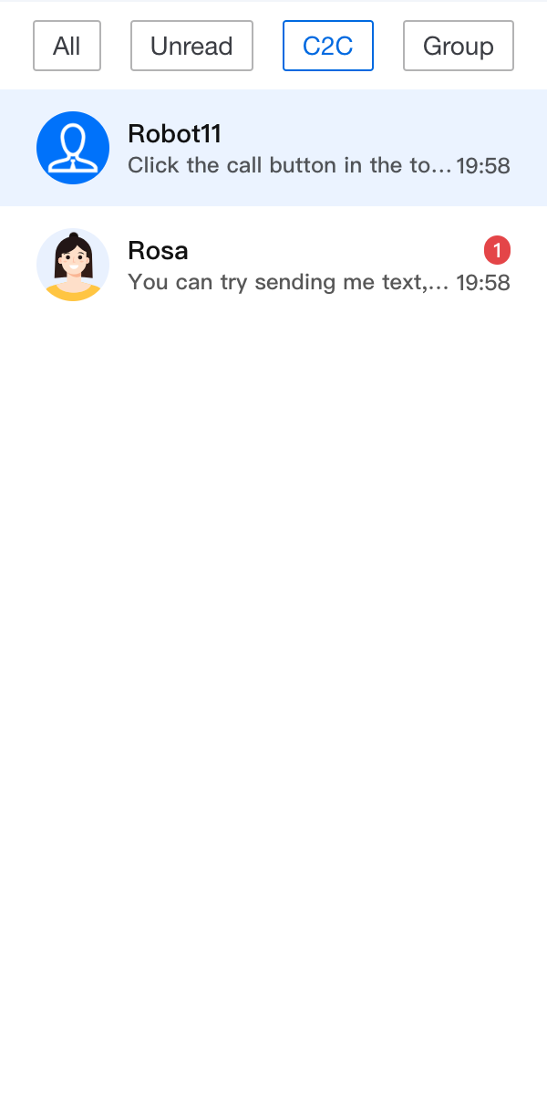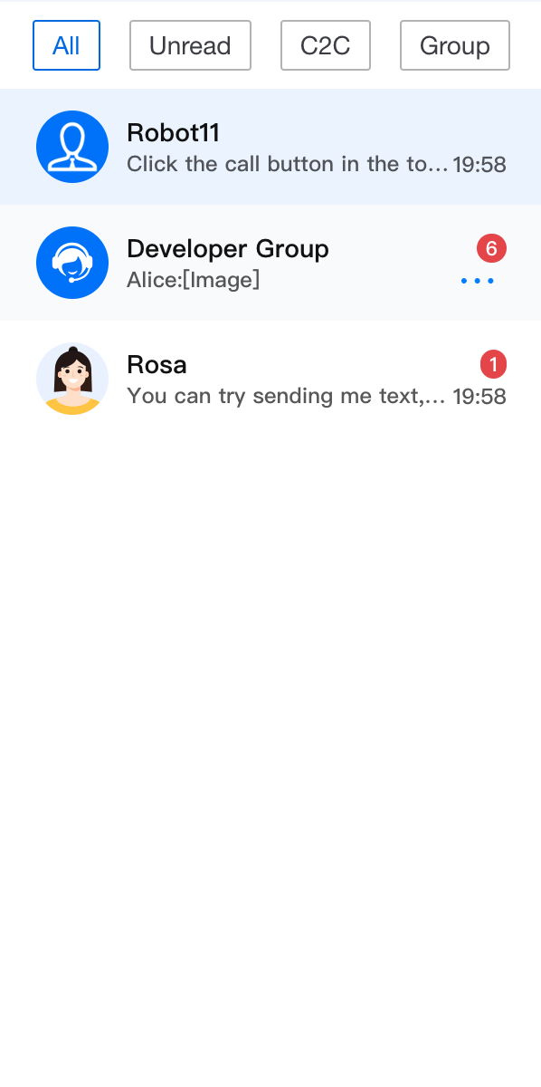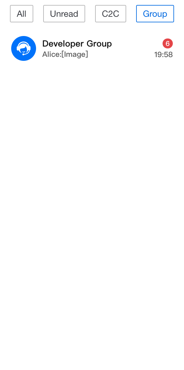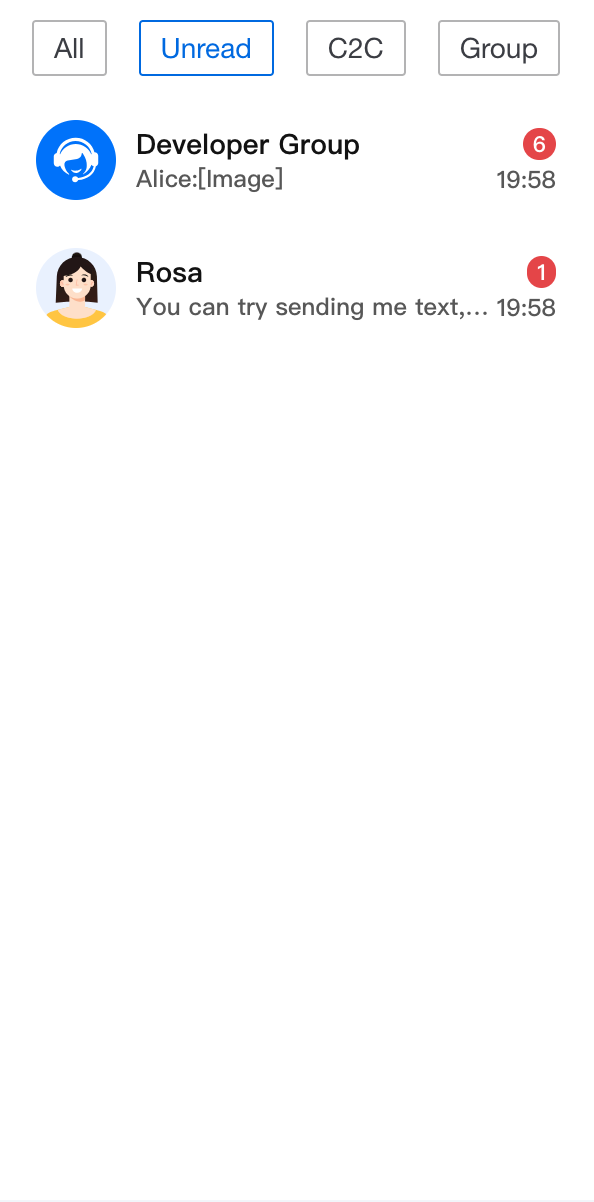 import { useState } from 'react';import TUIChatEngine from '@tencentcloud/chat-uikit-engine';import { ConversationList, UIKitProvider } from '@tencentcloud/chat-uikit-react';import type { ConversationListHeaderProps, ConversationModel } from '@tencentcloud/chat-uikit-react';const App = () => {const [currentFilter, setCurrentFilter] = useState<string>('all');const conversationGroupFilter: Record<string, (conversationList: ConversationModel[]) => ConversationModel[]> = {all: (conversationList: ConversationModel[]) => conversationList,unread: (conversationList: ConversationModel[]) => conversationList?.filter((item: ConversationModel) => item.unreadCount > 0),c2c: (conversationList: ConversationModel[]) => conversationList?.filter((item: ConversationModel) => item.type === TUIChatEngine.TYPES.CONV_C2C),group: (conversationList: ConversationModel[]) => conversationList?.filter((item: ConversationModel) => item.type === TUIChatEngine.TYPES.CONV_GROUP),};const CustomConversationListHeader = (props: IConversationListHeaderProps) => {return (<div className="conversation-group-wrapper"><button className={currentFilter === 'all' ? 'btn-active' : 'btn-default'} onClick={() => setCurrentFilter('all')}>All</button><button className={currentFilter === 'unread' ? 'btn-active' : 'btn-default'} onClick={() => setCurrentFilter('unread')}>Unread</button><button className={currentFilter === 'c2c' ? 'btn-active' : 'btn-default'} onClick={() => setCurrentFilter('c2c')}>C2C</button><button className={currentFilter === 'group' ? 'btn-active' : 'btn-default'} onClick={() => setCurrentFilter('group')}>Group</button></div>);};return (<UIKitProvider><ConversationListstyle={{ maxWidth: '300px', height: '600px' }}Header={CustomConversationListHeader}filter={conversationGroupFilter[currentFilter]}/></UIKitProvider>);};
