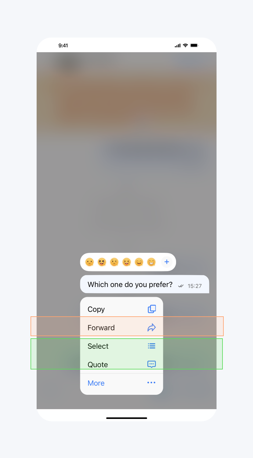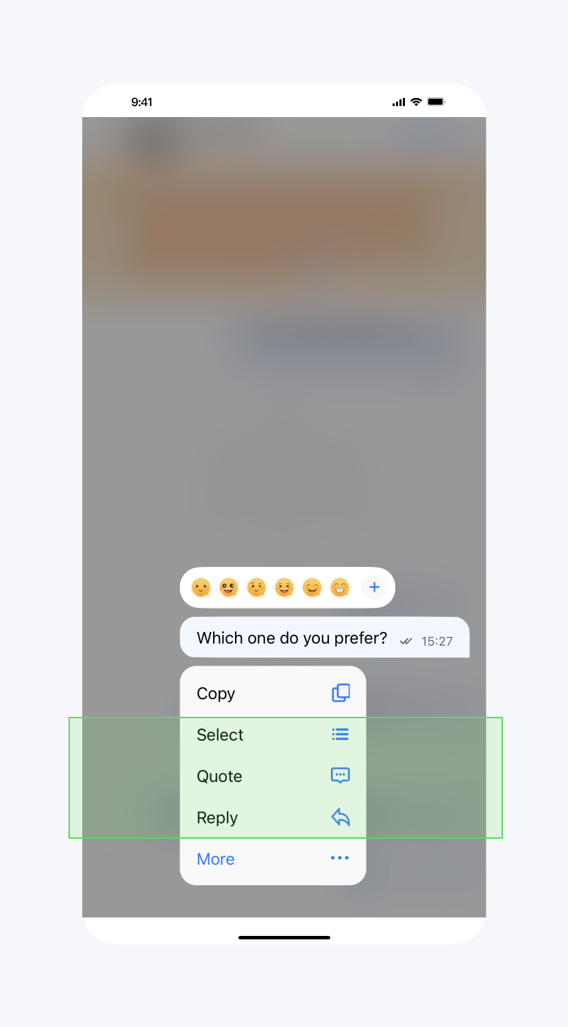 // TUIChatConfigMinimalist.javapublic static final int REPLY = 1; public static final int QUOTE = 2; public static final int EMOJI_REACTION = 3; public static final int PIN = 4; public static final int RECALL = 5; public static final int TRANSLATE = 6; public static final int CONVERT = 7; public static final int FORWARD = 8; public static final int SELECT = 9; public static final int COPY = 10; public static final int DELETE = 11; public static final int INFO = 12; public static final int SPEAKER_MODE_SWITCH = 13; @IntDef({REPLY, QUOTE, EMOJI_REACTION, PIN, RECALL, TRANSLATE, CONVERT, FORWARD, SELECT, COPY, DELETE, INFO, SPEAKER_MODE_SWITCH}) public @interface LongPressPopMenuItem {}/*** Hide the items in the pop-up menu when user presses the message.*/public static void hideItemsWhenLongPressMessage(@LongPressPopMenuItem int... items)