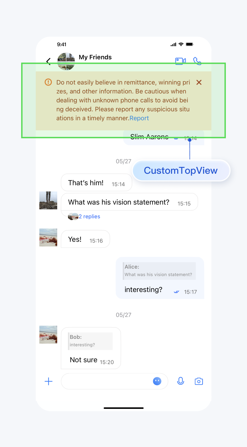 // When to call: Before initializing the message list interface.// tipsView is your customized view.TUIChatConfigMinimalist.setCustomTopView(tipsView);