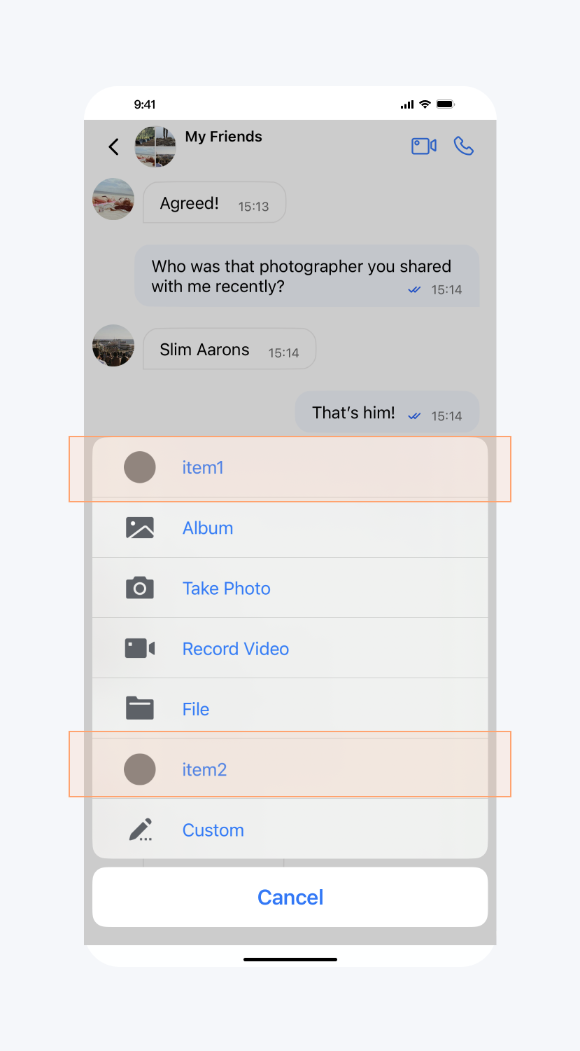 // When to call: After initializing the message list interface and before entering it.TUIChatConfigMinimalist.setChatInputMoreDataSource(new TUIChatConfigMinimalist.ChatInputMoreDataSource() {@Overridepublic List<InputMoreItem> inputBarShouldAddNewItemToMoreMenuOfInfo(ChatInfo chatInfo) {InputMoreItem inputMoreItem = new InputMoreItem() {@Overridepublic void onAction(String chatInfoId, int chatType) {ToastUtil.toastShortMessage("on click");}};inputMoreItem.setName("item1");inputMoreItem.setPriority(10000);inputMoreItem.setIconResId(R.drawable.ic_launcher);InputMoreItem inputMoreItem2 = new InputMoreItem() {@Overridepublic void onAction(String chatInfoId, int chatType) {ToastUtil.toastShortMessage("on click");}};inputMoreItem2.setName("item1");inputMoreItem2.setPriority(8000);inputMoreItem2.setIconResId(R.drawable.ic_launcher);return Arrays.asList(inputMoreItem, inputMoreItem2);}});