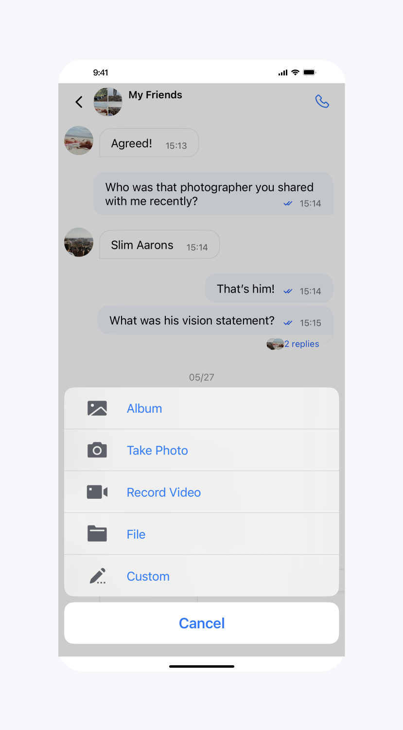 // When to call: After initializing the message list interface and before entering it.TUIChatConfigMinimalist.hideItemsInMoreMenu(TUIChatConfigMinimalist.CUSTOM,TUIChatConfigMinimalist.RECORD_VIDEO,TUIChatConfigMinimalist.FILE);