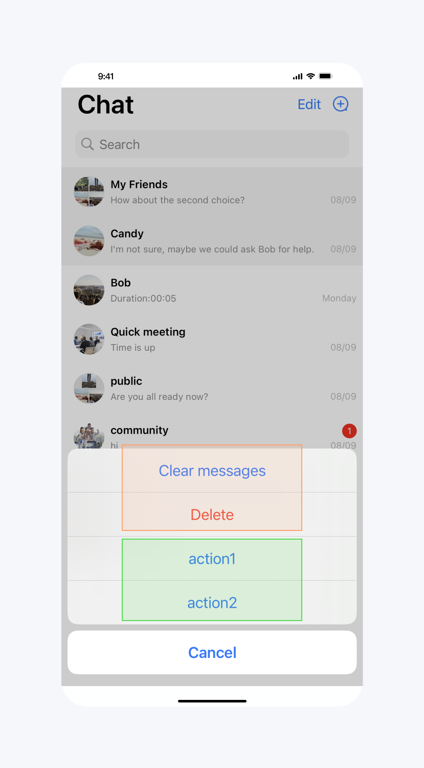 // TUIConversationConfigMinimalist.javapublic interface ConversationMenuItemDataSource {/*** Implement this method to add new items.*/default List<ConversationPopMenuItem> conversationShouldAddNewItemsToMoreMenu(ConversationInfo conversationInfo) { return new ArrayList<>(); }/*** Implement this method to hide items in more menu.*/default @ConversationMenuItem List<Integer> conversationShouldHideItemsInMoreMenu(ConversationInfo conversationInfo) { return new ArrayList<>(); }}