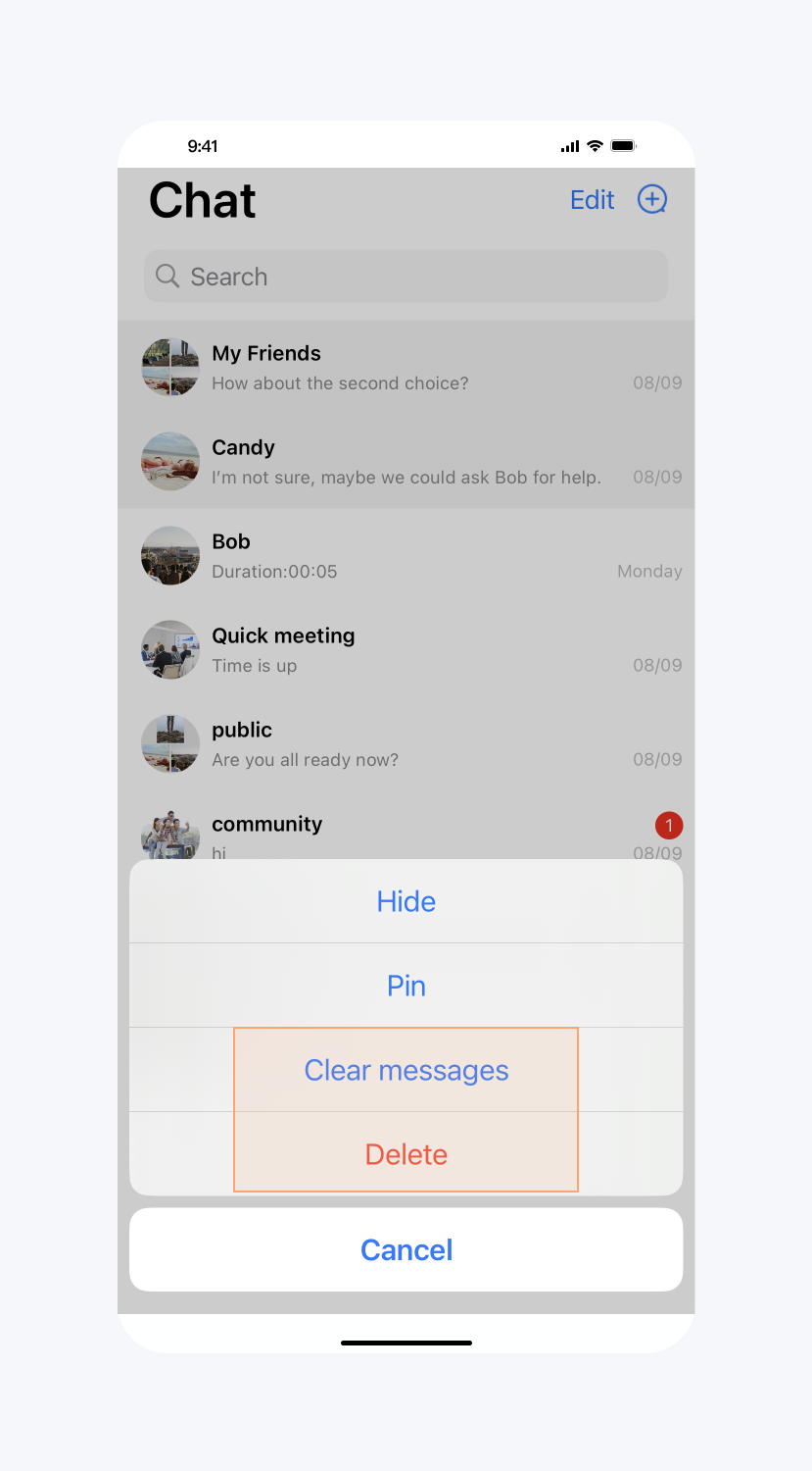 // When to call: Before initializing conversation list.TUIConversationConfigMinimalist.setConversationMenuItemDataSource(new TUIConversationConfigMinimalist.ConversationMenuItemDataSource() {@Overridepublic List<Integer> conversationShouldHideItemsInMoreMenu(ConversationInfo conversationInfo) {return Arrays.asList(TUIConversationConfigMinimalist.HIDE,TUIConversationConfigMinimalist.PIN);}@Overridepublic List<ConversationPopMenuItem> conversationShouldAddNewItemsToMoreMenu(ConversationInfo conversationInfo) {ConversationPopMenuItem item = new ConversationPopMenuItem();item.text = "action1";item.iconResId = R.drawable.ic_launcher;item.onClickListener = new View.OnClickListener() {@Overridepublic void onClick(View v) {ToastUtil.toastShortMessage("action1 clicked");}};ConversationPopMenuItem item2 = new ConversationPopMenuItem();item2.text = "action2";item2.iconResId = R.drawable.ic_launcher;item2.onClickListener = new View.OnClickListener() {@Overridepublic void onClick(View v) {ToastUtil.toastShortMessage("action2 clicked");}};return Arrays.asList(item, item2);}});
