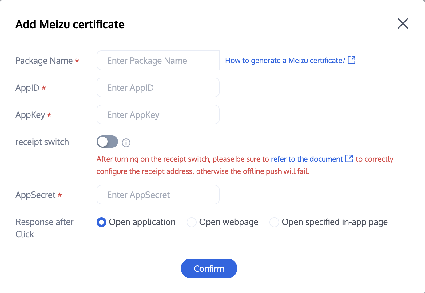 登录腾讯云 即时通信 Chat 控制台 ,在推送管理 > 接入设置功能栏添加各个厂商推送证书,并将您在步骤一中获取的各厂商的 AppId、AppKey、AppSecret 等参数配置给添加的推送证书。 关于点击后续动作选项的说明: