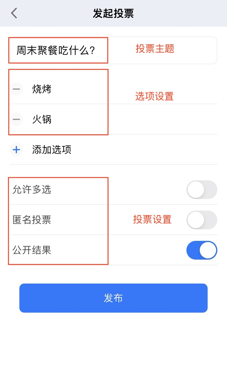 后,可以在接下来的发起投票界面,设置投票主题、选项,并进行相关设置,如下图所示: