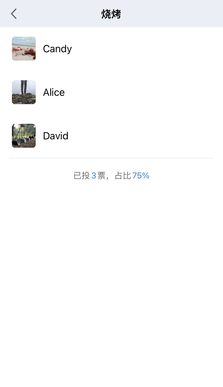 投票结束或本人完成投票后,可以看到当前的投票数据统计。单击某一选项可查看详细的投票成员列表,如下图所示: