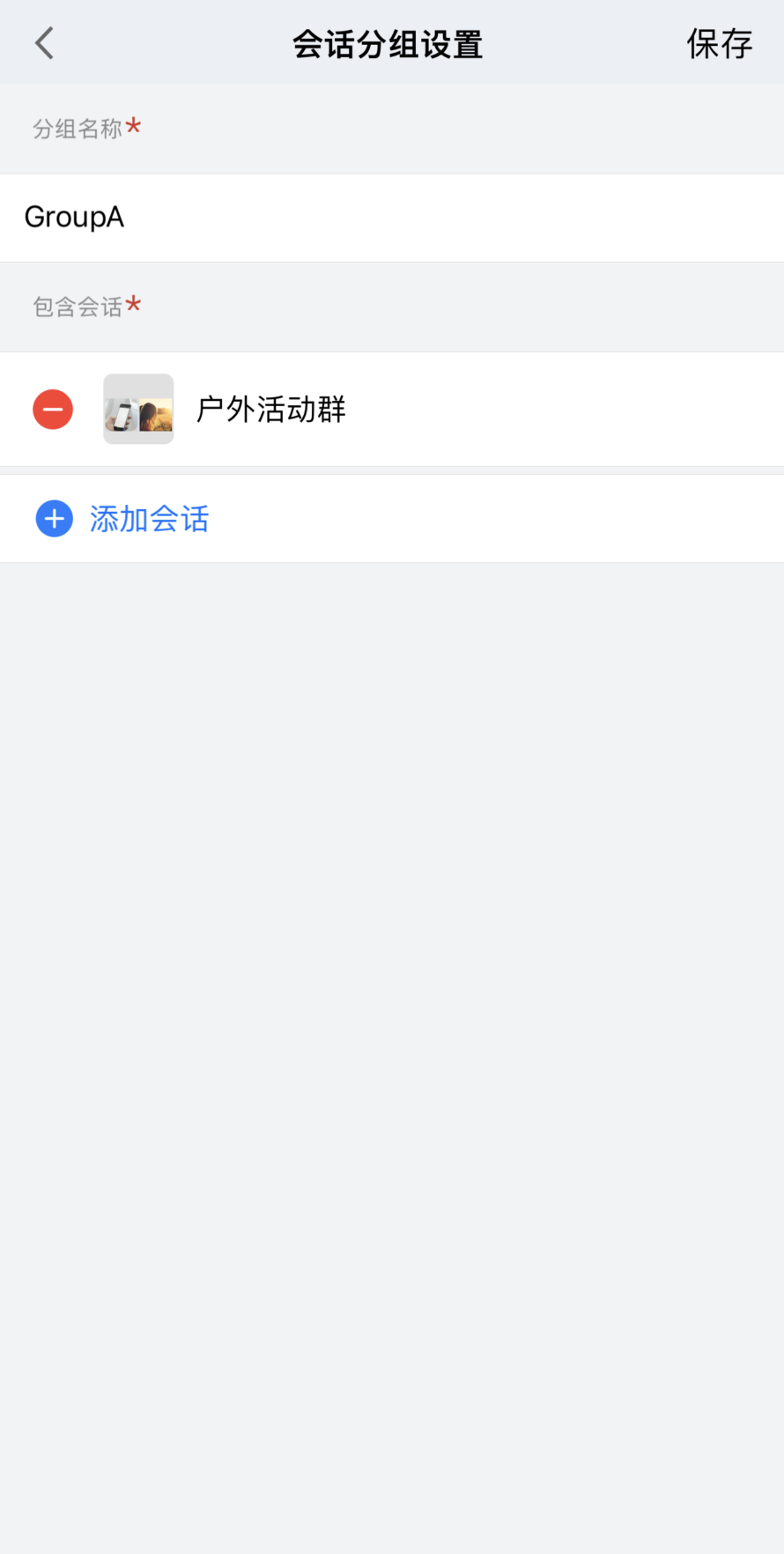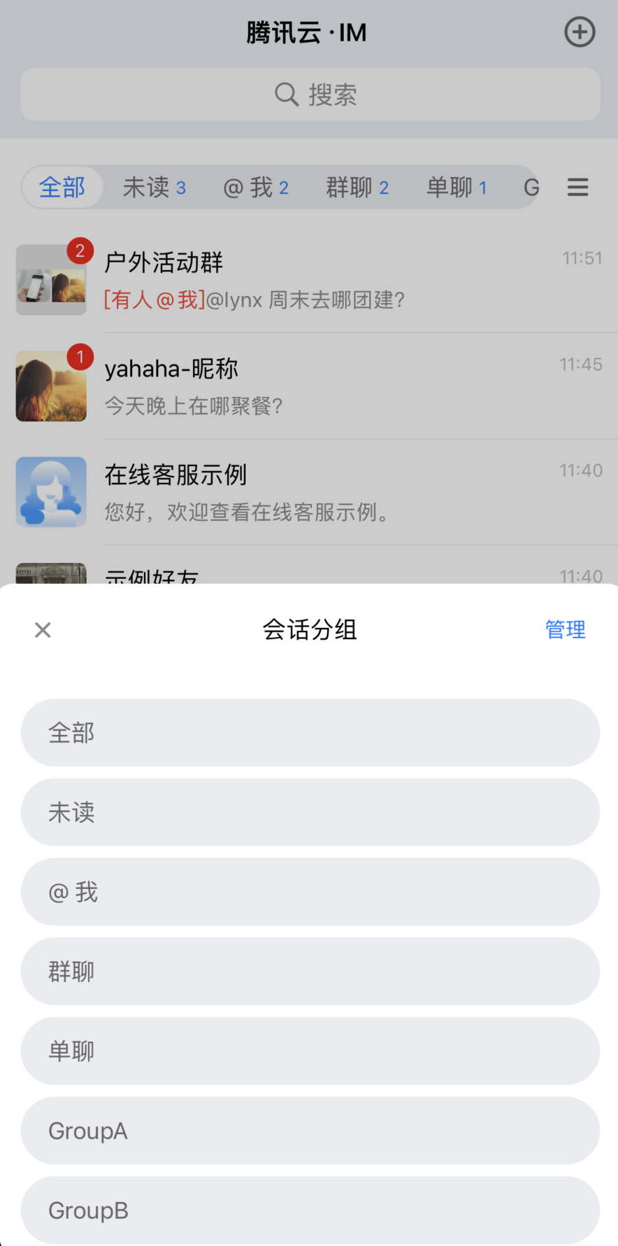 会话分组栏默认会展示“全部”、“未读”、“@我”三个常驻分组,如果不需要某个分组,可以在分组管理界面隐藏对应分组。