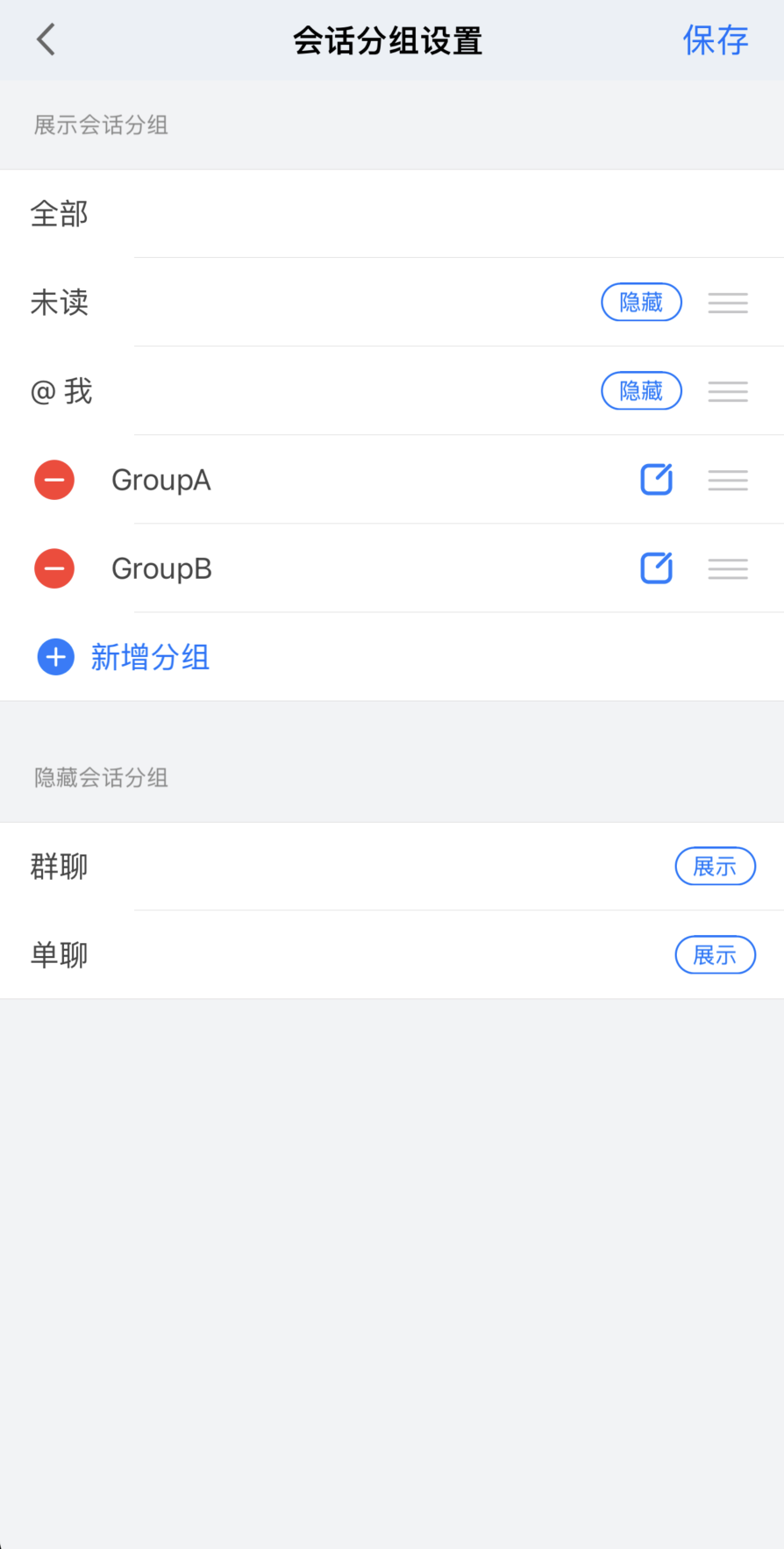 在会话分组列表界面,点击右上角的“管理”按钮,就可以跳转到分组管理界面,在分组管理界面您可以创建、删除、编辑、隐藏分组,也能对分组进行重排序,如下图所示: