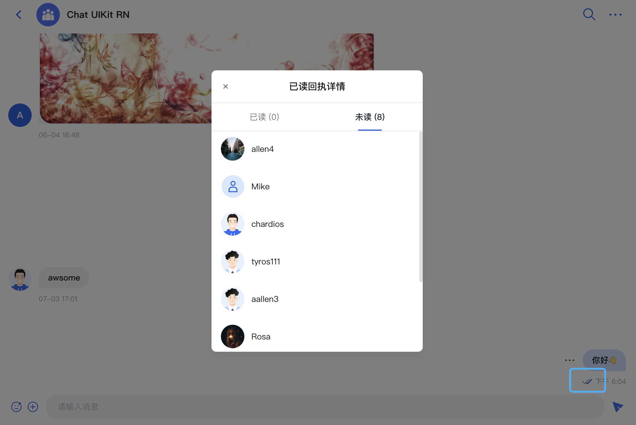 enableReadReceipt 属性置为 true 即视为开启已读回执(如果不填,默认值为 false)。import {Chat,ChatHeader,ConversationList,MessageInput,MessageList,} from '@tencentcloud/chat-uikit-react';function App() {return (<UIKitProvidertheme="dark"language="zh-CN"><div style={{ display: 'flex', height: '100vh' }}><ConversationList style={{ minWidth: '30%' }} /><Chat><ChatHeader />// 开启已读回执功能<MessageList enableReadReceipt={true} /><MessageInput /></Chat></div></UIKitProvider>);}export default App;