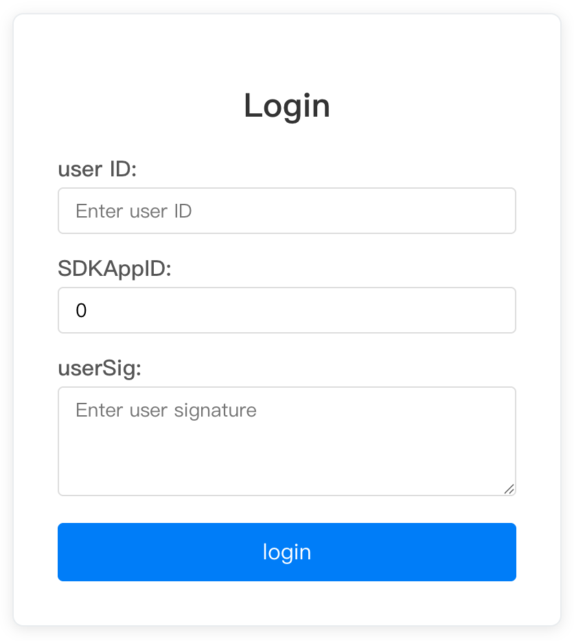 import React, { useState } from 'react';import { useLoginState, LoginStatus } from './states/LoginState/LoginState';function ManualLoginApp() {const { login, logout, status, error, client } = useLoginState(); // 不传配置const [loginForm, setLoginForm] = useState({userID: '',SDKAppID: 0,userSig: '',});const handleLogin = async () => {try {await login({...loginForm,onSuccess: () => {console.log('登录成功!');// 可以在这里进行登录后的操作},onError: (error) => {console.error('登录失败:', error);// 可以在这里处理登录错误},});} catch (error) {console.error('登录异常:', error);}};const handleLogout = async () => {try {await logout();console.log('登出成功!');} catch (error) {console.error('登出失败:', error);}};const isLoggedIn = status === LoginStatus.SUCCESS;return (<div className="manual-login-app">{!isLoggedIn ? (<div className="login-form"><h2>登录</h2><div className="form-group"><label>用户 ID:</label><inputtype="text"value={loginForm.userID}onChange={(e) => setLoginForm(prev => ({ ...prev, userID: e.target.value }))}placeholder="请输入用户 ID"/></div><div className="form-group"><label>SDK App ID:</label><inputtype="number"value={loginForm.SDKAppID}onChange={(e) => setLoginForm(prev => ({ ...prev, SDKAppID: Number(e.target.value) }))}placeholder="请输入 SDK App ID"/></div><div className="form-group"><label>用户签名:</label><textareavalue={loginForm.userSig}onChange={(e) => setLoginForm(prev => ({ ...prev, userSig: e.target.value }))}placeholder="请输入用户签名"/></div><buttononClick={handleLogin}disabled={status === LoginStatus.LOADING}className="login-btn">{status === LoginStatus.LOADING ? '登录中...' : '登录'}</button>{error && (<div className="error-message">错误: {error.message}</div>)}</div>) : (<div className="app-content"><div className="app-header"><h1>聊天应用</h1><button onClick={handleLogout} className="logout-btn">登出</button></div><ChatApp client={client} /></div>)}</div>);}export default ManualLoginApp;