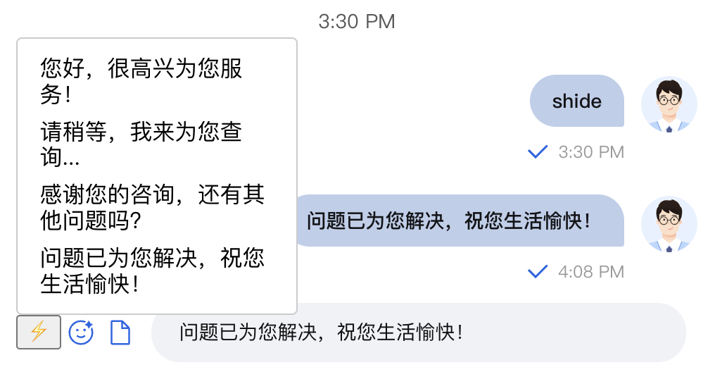 import { Chat, MessageInput, useMessageInputState } from '@tencentcloud/chat-uikit-react';// 快捷回复组件function QuickReplyPicker() {const { setContent } = useMessageInputState();const quickReplies = ['您好,很高兴为您服务!','请稍等,我来为您查询...','感谢您的咨询,还有其他问题吗?','问题已为您解决,祝您生活愉快!'];const handleQuickReply = (text: string) => {setContent(text);};return (<div style={{ position: 'relative' }}><button title="快捷回复">⚡</button><div style={{position: 'absolute',bottom: '100%',left: 0,background: 'white',border: '1px solid #ccc',borderRadius: '4px',padding: '8px',minWidth: '200px'}}>{quickReplies.map((reply, index) => (<divkey={index}onClick={() => handleQuickReply(reply)}style={{padding: '4px 8px',cursor: 'pointer',borderRadius: '2px'}}>{reply}</div>))}</div></div>);}function CustomerServiceChat() {const actions = [{key: 'quickReply',label: '快捷回复',component: QuickReplyPicker},'EmojiPicker','FilePicker'];return (<Chat><MessageInput actions={actions} /></Chat>);}