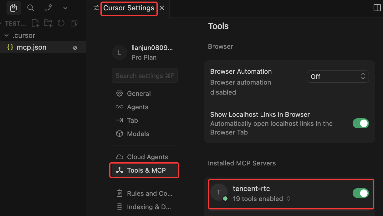 4. 配置完成,在 Cursor 的 Settings - Tools & MCP 选项中检查 MCP 工具是否成功加载 tools。