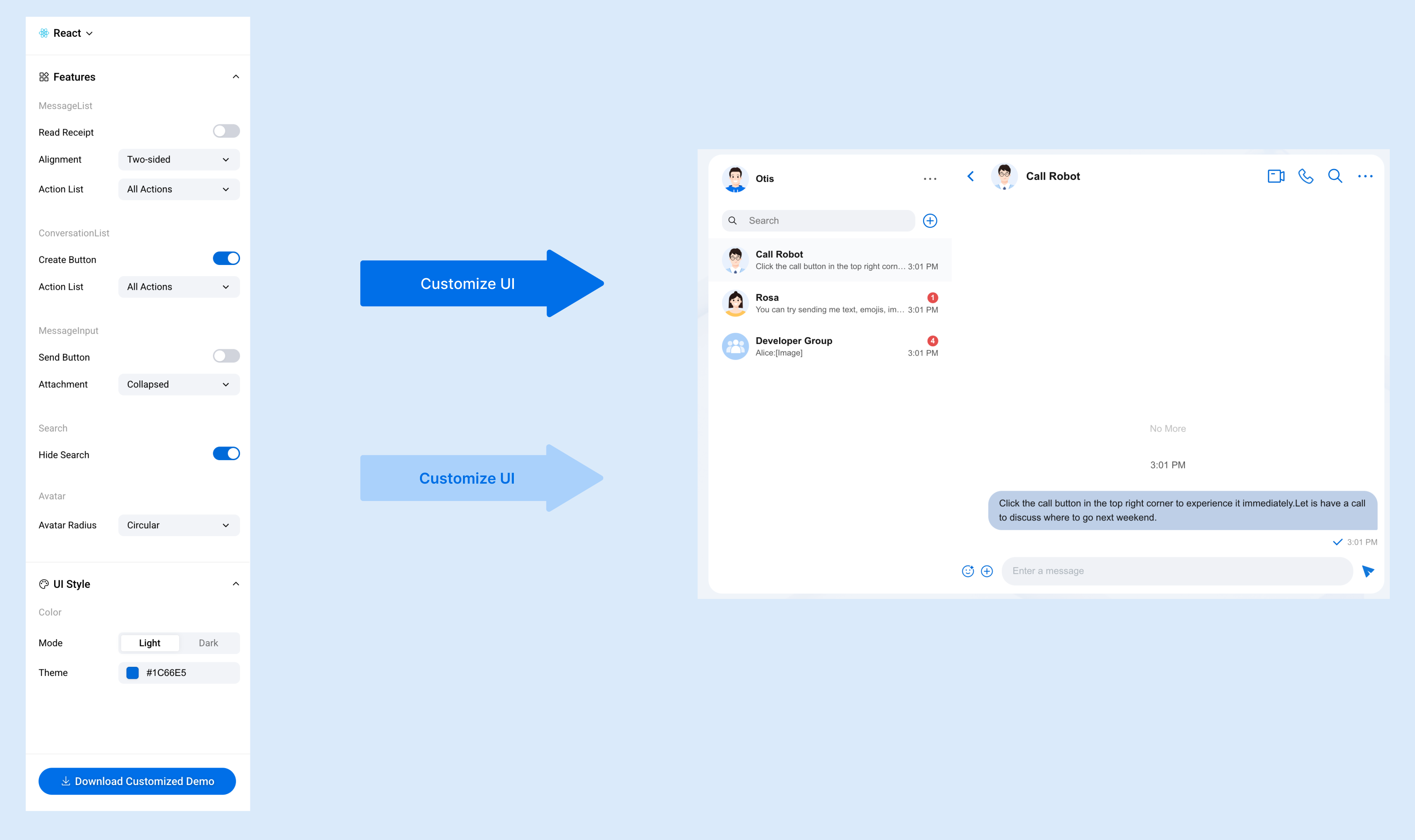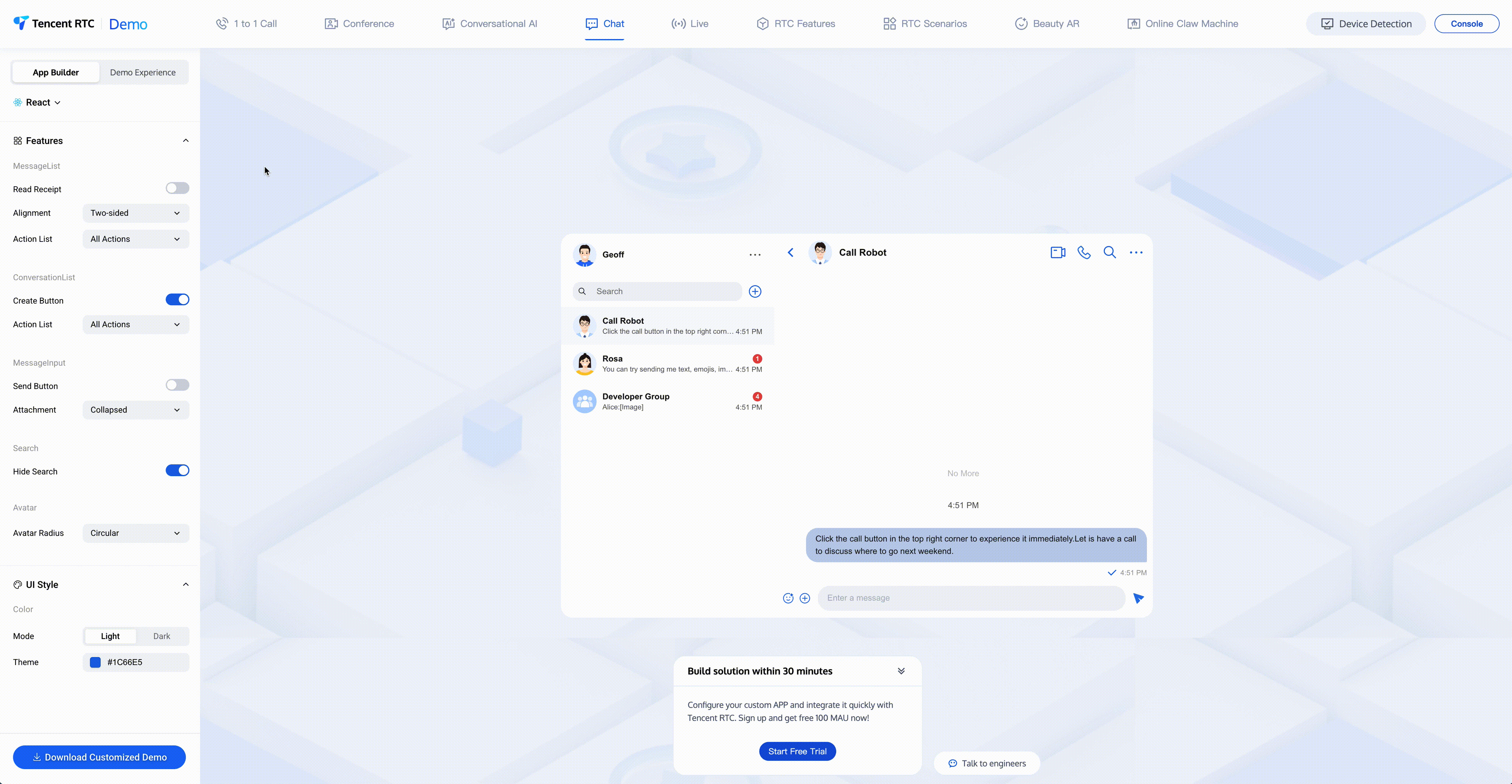 App Builder 提供开箱即用的可视化 UI 组件系统,支持从基础控件(例如 Color 等)到核心组件(例如 messageList、Search 等)的全类型配置,开发者可高效构建和调试应用。支持配置一键导出为配置文件,方便您快速集成到现有项目。