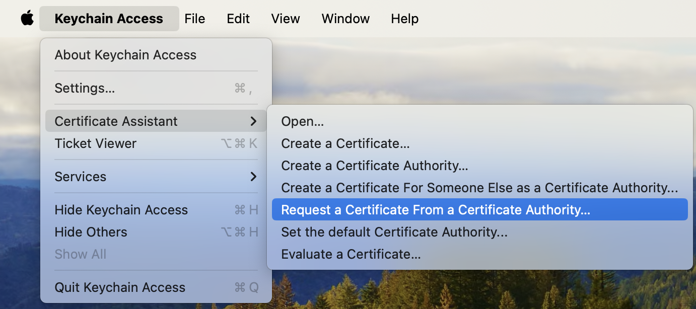 们先选择开发环境(Development)的 Create Certificate,系统将提示我们需要一个 Certificate Signing Request(CSR)。 4. 在 Mac 上打开钥匙串访问工具(Keychain Access),在菜单中选择钥匙串访问 > 证书助理 > 从证书颁发机构请求证书(Keychain Access - Certificate Assistant - Request a Certificate From a Certificate Authority)。
