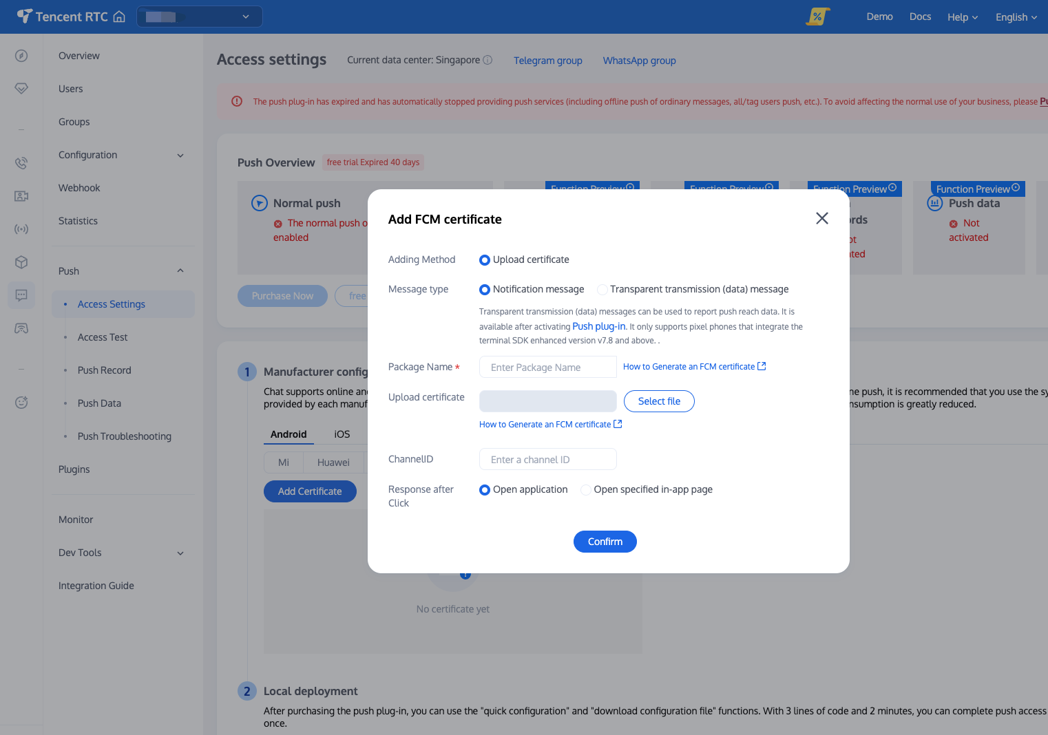 集成 消息推送 插件之前,需要先向 Apple 申请 APNs 推送证书,然后上传推送证书到 Chat 控制台 。之后按照快速接入步骤接入即可。