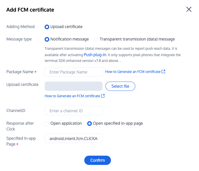 template <class T>class DemoPushValueCallback : public PushValueCallback<T> {public:using SuccessCallback = std::function<void(const T &)>;using ErrorCallback = std::function<void(int, const FString &)>;DemoPushValueCallback<T>() = default;~DemoPushValueCallback() override = default;void SetCallback(SuccessCallback success_cb, ErrorCallback error_cb) {success_callback_ = std::move(success_cb);error_callback_ = std::move(error_cb);}void OnSuccess(const T &value) override {if (success_callback_) {success_callback_(value);}}void OnError(int error_code, const FString &error_message) override {if (error_callback_) {error_callback_(error_code, error_message);}}private:SuccessCallback success_callback_;ErrorCallback error_callback_;};auto callback = new DemoPushValueCallback<FString>();callback->SetCallback([=](const FString &value) {UE_LOG(LogTemp, Warning, TEXT("Push succeed, device token is %s"), *value);delete callback;},[=](int error_code, const FString &error_message) {UE_LOG(LogTemp, Warning, TEXT("Push failed erro code: %d, desc: %s"), error_code, *error_message);delete callback;});PushManager::GetInstance()->RegisterPush(您的 sdkAppId, "您的 appKey", callback);
