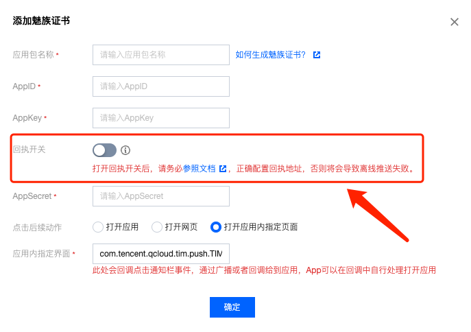 打开回执开关 | 配置回执地址 |