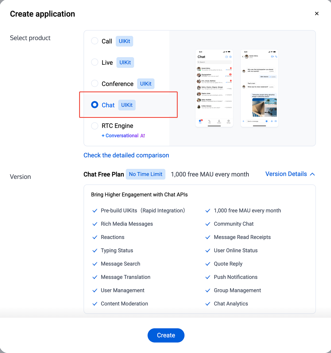 2. 在创建弹窗中输入 Application name,选择 Chat,并选择合适的 Deployment Region,点击 Create,即可完成免费版的创建。