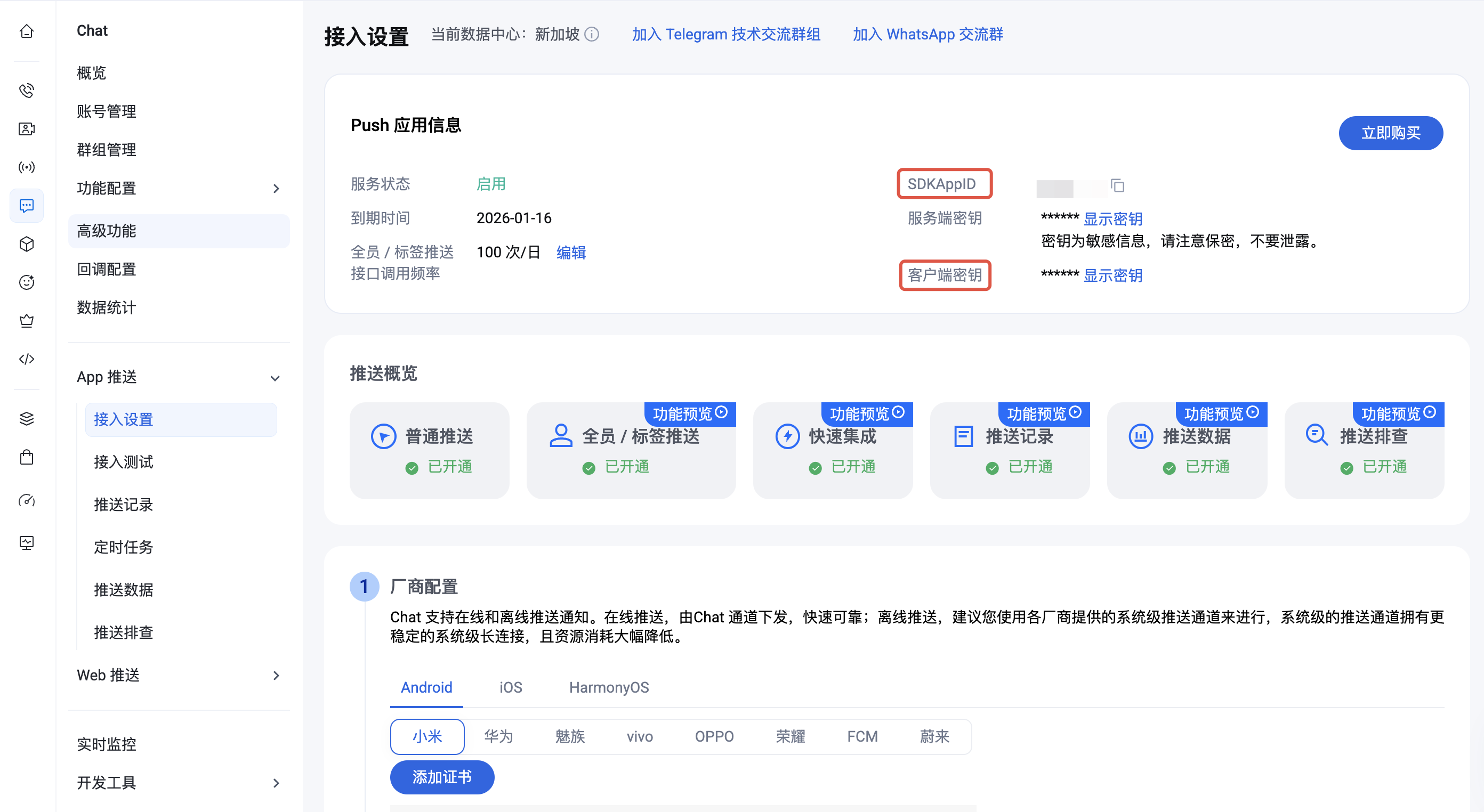 import WebPush from '@tencentcloud/web-push';const SDKAppID = 0; // 您的 SDKAppIDconst appKey = ''; // 客户端密钥const userID = ''; // 用户 ID// 注册推送服务WebPush.registerPush({ SDKAppID, appKey, userID }).then((data) => {console.log('registerPush ok', data);});// 监听推送消息WebPush.addPushListener(WebPush.EVENT.MESSAGE_RECEIVED, (message) => {console.log('收到推送消息:', message);});// 监听通知点击WebPush.addPushListener(WebPush.EVENT.NOTIFICATION_CLICKED, (data) => {console.log('通知被点击:', data);});